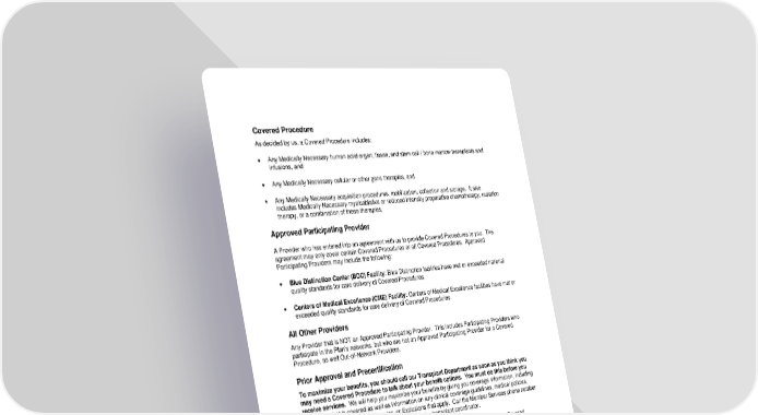 47 Covered Procedure As decided by us, a Covered Procedure includes: • Any Medically Necessary human solid organ, tissue, and stem cell / bone marrow transplants and infusions, and • Any Medically Necessary cellular or other gene therapies, and • Any Medically Necessary acquisition procedures, mobilization, collection and storage. It also includes Medically Necessary myeloablative or reduced intensity preparative chemotherapy, radiation therapy, or a combination of these therapies, Approved Participating Provider A Provider who has entered into an agreement with us to provide Covered Procedures to you. The agreement may only cover certain Covered Procedures or all Covered Procedures. Approved Participating Providers may include the following: • Blue Distinction Center (BDC) Facility: Blue Distinction facilities have met or exceeded national quality standards for care delivery of Covered Procedures. • Centers of Medical Excellence (CME) Facility: Centers of Medical Excellence facilities have met or exceeded quality standards for care delivery of Covered Procedures. All Other Providers Any Provider that is NOT an Approved Participating Provider. This includes Participating Providers who participate in the Plan’s networks, but who are not an Approved Participating Provider for a Covered Procedure, as well Out-of-Network Providers. Prior Approval and Precertification To maximize your benefits, you should call our Transplant Department as soon as you think you may need a Covered Procedure to talk about your benefit options. You must do this before you receive services. We will help you maximize your benefits by giving you coverage information, including details on what is covered as well as information on any clinical coverage guidelines, medical policies, Approved Participating Provider rules, or Exclusions that apply. Call the Member Services phone number on the back of your Identification Card and ask for the transplant coordinator. You or your Provider must call our Transplant Department for Precertification prior to the Covered Procedure whether this is performed in an Inpatient or Outpatient setting. Your Doctor must certify, and we must agree, that the Covered Procedure is Medically Necessary. Your Doctor should send a written request for Precertification to us as soon as possible to start this process. Not getting Precertification will result in a denial of benefits. Please note that there are cases where your Provider asks for approval for Human Leukocyte Antigen (HLA) testing, donor searches and/or a collection and storage of stem cells prior to the final decision as to what Covered Procedure will be needed. In these cases, the HLA testing and donor search charges will be covered as routine diagnostic tests. The collection and storage request will be reviewed for Medical Necessity and may be approved. However, such an approval for HLA testing, donor search and/or collection and storage is NOT an approval for the later Covered Procedure. A separate Medical Necessity decision will be needed for the Covered Procedure.