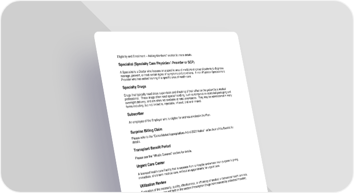 120 Eligibility and Enrollment – Adding Members” section for more details. Specialist (Specialty Care Physician \ Provider or SCP) A Specialist is a Doctor who focuses on a specific area of medicine or group of patients to diagnose, manage, prevent, or treat certain types of symptoms and conditions. A non-Physician Specialist is a Provider who has added training in a specific area of health care. Specialty Drugs Drugs that typically need close supervision and checking of their effect on the patient by a medical professional. These drugs often need special handling, such as temperature-controlled packaging and overnight delivery, and are often not available at retail pharmacies. They may be administered in many forms including, but not limited to, injectable, infused, oral and inhaled. Subscriber An employee of the Employer who is eligible for and has enrolled in the Plan. Surprise Billing Claim Please refer to the “Consolidated Appropriations Act of 2021 Notice” at the front of this Booklet for details. Transplant Benefit Period Please see the “What’s Covered” section for details. Urgent Care Center A licensed health care Facility that is separate from a Hospital and whose main purpose is giving immediate, short-term medical care, without an appointment, for urgent care. Utilization Review Evaluation of the necessity, quality, effectiveness, or efficiency of medical or behavioral health services, Prescription Drugs (as set forth in the section Prescription Drugs Administered by a Medical Provider), procedures, and/or facilities.