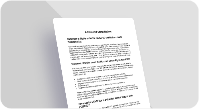 5 Additional Federal Notices Statement of Rights under the Newborns’ and Mother’s Health Protection Act Group health plans and health insurance issuers generally may not, under Federal law, restrict benefits for any Hospital length of stay in connection with childbirth for the mother or newborn child to less than 48 hours following a vaginal delivery, or less than 96 hours following a cesarean section. However, Federal law generally does not prohibit the mother’s or newborn’s attending Provider, after consulting with the mother, from discharging the mother or her newborn earlier than 48 hours (or 96 hours as applicable). In any case, plans and issuers may not, under Federal law, require that a provider obtain authorization from the Plan or the insurance issuer for prescribing a length of stay not in excess of 48 hours (or 96 hours). Statement of Rights under the Women’s Cancer Rights Act of 1998 If you have had or are going to have a mastectomy, you may be entitled to certain benefits under the Women’s Health and Cancer Rights Act of 1998 (WHCRA). For individuals receiving mastectomy-related benefits, coverage will be provided in a manner determined in consultation with the attending Physician and the patient, for: • All stages of reconstruction of the breast on which the mastectomy was performed; • Chest wall reconstruction and aesthetic flat closure (as defined by the National Cancer Institute); • Surgery and reconstruction of the other breast to produce a symmetrical appearance; • Prostheses; and • Treatment of physical complications of the mastectomy, including lymphedema. These benefits will be provided subject to the same Deductibles and Coinsurance applicable to other medical and surgical benefits provided under this Plan. (See the “Schedule of Benefits” for details.) If you would like more information on WHCRA benefits, call the Claims Administrator at the number on the back of your Identification Card. Coverage for a Child Due to a Qualified Medical Support Order (“QMCSO”) If you or your spouse are required, due to a QMCSO, to provide coverage for your child(ren), you may ask the Employer to provide you, without charge, a written statement outlining the procedures for getting coverage for such child(ren). Mental Health Parity and Addiction Equity Act The Mental Health Parity and Addiction Equity Act provides for parity in the application of aggregate treatment limitations (day or visit limits) on Mental Health and Substance Use Disorder benefits with day or visit limits on medical and surgical benefits. In general, group health plans offering Mental Health and Substance Use Disorder benefits cannot set day/visit limits on mental health or substance use disorder benefits that are lower than any such day or visit limits for medical and surgical benefits. A plan that does not impose day or visit limits on medical and surgical benefits may not impose such day or visit limits on Mental Health and Substance Use Disorder benefits offered under the Plan. Also, the Plan may not impose Deductibles, Copayment, Coinsurance, and Out-of-Pocket expenses on Mental Health and Substance Use Disorder benefits that are more restrictive than the predominant Deductibles, Copayment, Coinsurance and out of pocket expenses applicable to substantially all medical and surgical benefits in the same classification. Medical Necessity criteria are available upon request.
