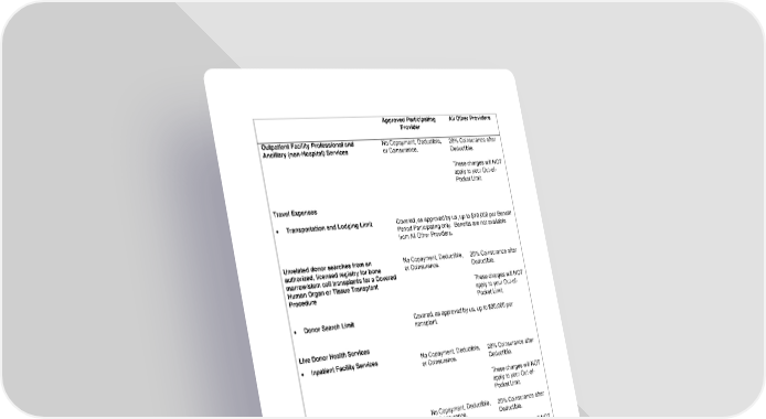 27 Approved Participating Provider All Other Providers Outpatient Facility Professional and Ancillary (non-Hospital) Services No Copayment, Deductible, or Coinsurance. 20% Coinsurance after Deductible. These charges will NOT apply to your Out-of- Pocket Limit. Travel Expenses • Transportation and Lodging Limit Covered, as approved by us, up to $10,000 per Benefit Period Participating only. Benefits are not available from All Other Providers. Unrelated donor searches from an authorized, licensed registry for bone marrow/stem cell transplants for a Covered Human Organ or Tissue Transplant Procedure No Copayment, Deductible, or Coinsurance. 20% Coinsurance after Deductible. These charges will NOT apply to your Out-of- Pocket Limit. • Donor Search Limit Covered, as approved by us, up to $30,000 per transplant. Live Donor Health Services • Inpatient Facility Services No Copayment, Deductible, or Coinsurance. 20% Coinsurance after Deductible. These charges will NOT apply to your Out-of- Pocket Limit. • Outpatient Facility Services No Copayment, Deductible, or Coinsurance. 20% Coinsurance after Deductible. These charges will NOT apply to your Out-of- Pocket Limit. Donor Health Service Limit For Human Organ and Tissue Transplants, Medically Necessary charges for getting an organ from a live donor are covered up to our Maximum Allowed Amount, including complications from the donor procedure for up to six weeks from the date of procurement.
