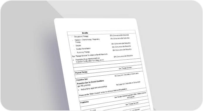 22 Benefits - Occupational Therapy 20% Coinsurance after Deductible - Radiation / Chemotherapy / Respiratory Therapy 20% Coinsurance after Deductible - Dialysis 20% Coinsurance after Deductible - Cardiac Rehabilitation 20% Coinsurance after Deductible - Pulmonary Therapy 20% Coinsurance after Deductible See “Therapy Services” for details on Benefit Maximums. • Prescription Drugs Administered in an Outpatient Facility (other than allergy serum) 20% Coinsurance after Deductible Physical Therapy See “Therapy Services.” Preventive Care No Copayment, Deductible, or Coinsurance Preventive Care for Chronic Conditions (per IRS guidelines) • Medical items, equipment and screenings No Copayment, Deductible, or Coinsurance Please see the “What’s Covered” section for additional detail on IRS guidelines. Prosthetics See “Durable Medical Equipment (DME), Medical Devices and Supplies.” Pulmonary Therapy See “Therapy Services.” Radiation Therapy See “Therapy Services.” Rehabilitation Services Benefits are based on the setting in which Covered Services are received. See “Inpatient Services” and “Therapy Services” for details on Benefit Maximums. Respiratory Therapy See “Therapy Services.” Skilled Nursing Facility See “Inpatient Services.”