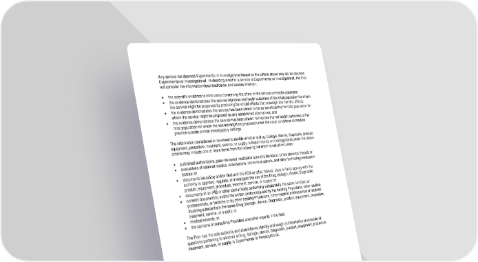 69 Any service not deemed Experimental or Investigational based on the criteria above may still be deemed Experimental or Investigational. In deciding whether a service is Experimental or Investigational, the Plan will consider the information described below and assess whether: • the scientific evidence is conclusory concerning the effect of the service on health outcomes; • the evidence demonstrates the service improves net health outcomes of the total population for whom the service might be proposed by producing beneficial effects that outweigh any harmful effects; • the evidence demonstrates the service has been shown to be as beneficial for the total population for whom the service might be proposed as any established alternatives; and • the evidence demonstrates the service has been shown to improve the net health outcomes of the total population for whom the service might be proposed under the usual conditions of medical practice outside clinical investigatory settings. The information considered or reviewed to decide whether a drug, biologic, device, diagnostic, product, equipment, procedure, treatment, service, or supply is Experimental or Investigational under the above criteria may include one or more items from the following list which is not all inclusive: • published authoritative, peer-reviewed medical or scientific literature, or the absence thereof; or • evaluations of national medical associations, consensus panels, and other technology evaluation bodies; or • documents issued by and/or filed with the FDA or other federal, state or local agency with the authority to approve, regulate, or investigate the use of the Drug, biologic, device, Diagnostic, product, equipment, procedure, treatment, service, or supply; or • documents of an IRB or other similar body performing substantially the same function; or • consent document(s) and/or the written protocol(s)used by the treating Physicians, other medical professionals, or facilities or by other treating Physicians, other medical professionals or facilities studying substantially the same Drug, biologic, device, Diagnostic, product, equipment, procedure, treatment, service, or supply; or • medical records; or • the opinions of consulting Providers and other experts in the field. The Plan has the sole authority and discretion to identify and weigh all information and decide all questions pertaining to whether a Drug, biologic, device, Diagnostic, product, equipment, procedure, treatment, service, or supply is Experimental or Investigational.