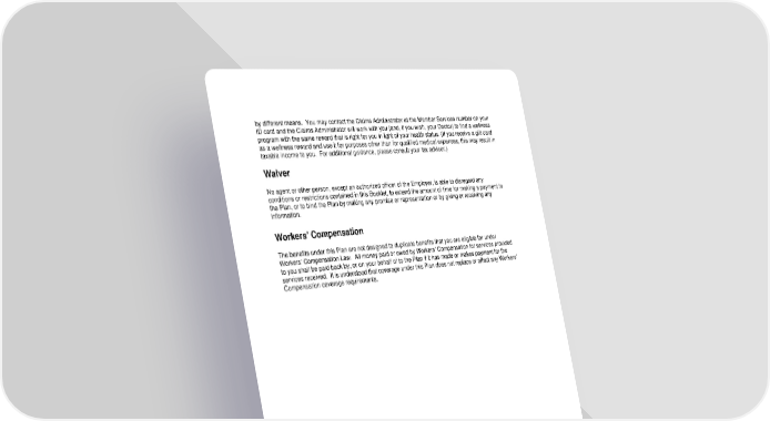 108 by different means. You may contact the Claims Administrator at the Member Services number on your ID card and the Claims Administrator will work with you (and, if you wish, your Doctor) to find a wellness program with the same reward that is right for you in light of your health status. (If you receive a gift card as a wellness reward and use it for purposes other than for qualified medical expenses, this may result in taxable income to you. For additional guidance, please consult your tax advisor.) Waiver No agent or other person, except an authorized officer of the Employer, is able to disregard any conditions or restrictions contained in this Booklet, to extend the amount of time for making a payment to the Plan, or to bind the Plan by making any promise or representation or by giving or receiving any information. Workers’ Compensation The benefits under this Plan are not designed to duplicate benefits that you are eligible for under Workers’ Compensation Law. All money paid or owed by Workers’ Compensation for services provided to you shall be paid back by, or on your behalf of to the Plan if it has made or makes payment for the services received. It is understood that coverage under this Plan does not replace or affect any Workers’ Compensation coverage requirements.
