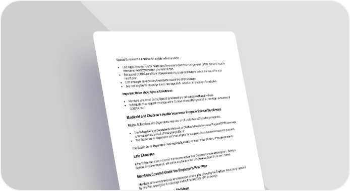 93 Special Enrollment is available for eligible individuals who: • Lost eligibility under a prior health plan for reasons other than non-payment of fees or due to fraud or intentional misrepresentation of a material fact. • Exhausted COBRA benefits or stopped receiving group contributions toward the cost of the prior health plan. • Lost employer contributions towards the cost of the other coverage; • Are now eligible for coverage due to marriage, birth, adoption, or placement for adoption. Important Notes about Special Enrollment: • Members who enroll during Special Enrollment are not considered Late Enrollees. • Individuals must request coverage within 31 days of a qualifying event (i.e., marriage, exhaustion of COBRA, etc.). Medicaid and Children’s Health Insurance Program Special Enrollment Eligible Subscribers and Dependents may also enroll under two additional circumstances: • The Subscriber’s or Dependent’s Medicaid or Children’s Health Insurance Program (CHIP) coverage is terminated as a result of loss of eligibility; or • The Subscriber or Dependent becomes eligible for a subsidy (state premium assistance program). The Subscriber or Dependent must request Special Enrollment within 60 days of the above events. Late Enrollees If the Subscriber does not enroll themselves and/or their Dependents when first eligible or during a Special Enrollment period, will not be eligible to enroll until the next Open Enrollment Period. Members Covered Under the Employer’s Prior Plan Members who were previously enrolled under another plan offered by the Employer that is being replaced by this Plan are eligible for coverage on the Effective Date of this coverage. Enrolling Dependent Children Newborn Children Newborn children are covered automatically from the moment of birth for a period of 31 days. To continue coverage beyond the 31 day period you should submit an application / change form to the Employer, within 31 days following the birth, to add the newborn to your Plan. Even if no additional fee is required, you should still submit an application / change form to the Employer to add the newborn to your Plan, to make sure the Claims Administrator has accurate records and are able to cover your claims. Newborn children coverage will be for injury or sickness, including: • The necessary care and treatment of medically diagnosed congenital defects and birth abnormalities; and