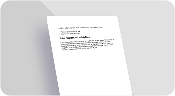 3 In addition, Anthem will provide access through its website to the following information: • Participating negotiated rates; and • Historical Non-Participating rates. Notice Regarding Retiree-Only Plans If this Plan is issued as part of a retiree-only plan, as defined by ERISA §732(a) and IRC §9831(a)(2), the provisions of the Consolidated Appropriations Act of 2021 will not apply, including the provisions regarding the No Surprises Act. In a retiree-only plan, Non-Participating Providers may bill you for any charges that exceed the Plan’s Maximum Allowed Amount. Please contact your Employer or former Employer if you are unsure whether your plan is a retiree-only plan.