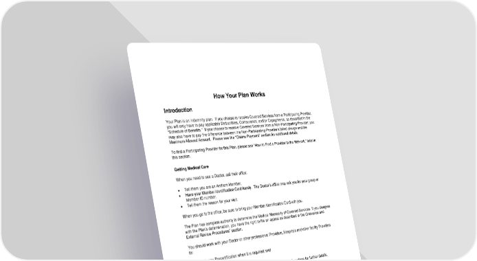 28 How Your Plan Works Introduction Your Plan is an indemnity plan. If you choose to receive Covered Services from a Participating Provider, you will only have to pay applicable Deductibles, Coinsurance, and/or Copayments, as described in the “Schedule of Benefits.” If you choose to receive Covered Services from a Non-Participating Provider, you may also have to pay the difference between the Non-Participating Provider’s billed charge and the Maximum Allowed Amount. Please see the “Claims Payment” section for additional details. To find a Participating Provider for this Plan, please see “How to Find a Provider in the Network,” later in this section. Getting Medical Care When you need to see a Doctor, call their office: • Tell them you are an Anthem Member, • Have your Member Identification Card handy. The Doctor’s office may ask you for your group or Member ID number. • Tell them the reason for your visit. When you go to the office, be sure to bring your Member Identification Card with you. The Plan has complete authority to determine the Medical Necessity of Covered Services. If you disagree with the Plan’s determination, you have the right to file an appeal as described in the Grievance and External Review Procedures” section. You should work with your Doctor or other professional Providers, Hospitals and other facility Providers to: • Obtain any Precertification when it is required; and • File claims. Please see the “Getting Approval for Benefits” and “Claims Payment” sections for further details. After Hours Care If you need care after normal business hours, your Doctor may have several options for you. You should call your Doctor’s office for instructions if you need care in the evenings, on weekends, or during the holidays and cannot wait until the office reopens. If you have an Emergency, call 911 or go to the nearest Emergency Room. Surprise Billing Claims Surprise Billing Claims are described in the “Consolidated Appropriations Act of 2021 Notice” at the beginning of this Booklet. Please refer to that section for further details.