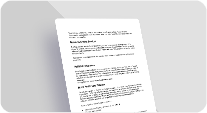 45 Treatment you get after your condition has stabilized is not Emergency Care. Please refer to the “Consolidated Appropriations Act of 2021 Notice” at the front of this Booklet for more details on how this will impact your benefits. Gender Affirming Services This Plan provides benefits for gender affirming services, including gender affirming surgery. To be eligible for benefits, services must be Medically Necessary and all inpatient Facility admissions must be approved in advance through Precertification. Please refer to the “Getting Approval for Benefits” section for further details. Details on our medical policies are also available online at www.anthem.com/provider/policies/clinical- guidelines/. Habilitative Services Benefits also include habilitative health care services and devices that help you keep, learn or improve skills and functioning for daily living. Examples include therapy for a child who isn’t walking or talking at the expected age. These services may include physical and occupational therapy, speech-language pathology and other services for people with disabilities in a variety of inpatient and/or outpatient settings. Please see “ Therapy Services” later in this section for further details. Home Health Care Services Benefits are available for Covered Services performed by a Home Health Care Agency or other Provider in your home. To be eligible for benefits, you must essentially be confined to the home, as an alternative to a Hospital stay, and be physically unable to get needed medical services on an outpatient basis. Services must be prescribed by a Doctor and the services must be so inherently complex that they can be safely and effectively performed only by qualified, technical, or professional health staff. Covered Services include but are not limited to: • Intermittent skilled nursing services by an R.N. or L.P.N. • Medical / social services • Diagnostic services • Nutritional guidance • Training of the patient and/or family/caregiver • Home health aide services. You must be receiving skilled nursing or therapy. Services must be given by appropriately trained staff working for the Home Health Care Provider. Other organizations may give services only when approved by the Claims Administrator, and their duties must be assigned and supervised by a professional nurse on the staff of the Home Health Care Provider. • Therapy Services (except for Manipulation Therapy, which will not be covered when given in the home) • Medical supplies • Durable medical equipment • Private duty nursing services • When available in your area, benefits are also available for Intensive In-home Behavioral Health Services. These do not require confinement to the home. These services are described in the “Mental Health and Substance Use Disorder Services” section below. Benefits may also be available for Inpatient Services in your home. These benefits are separate from the Home Health Care Services benefit, and are described in the “Inpatient Services” section below.