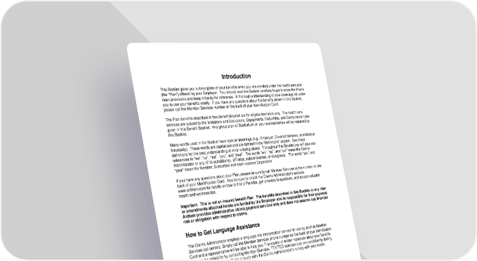 7 Introduction This Booklet gives you a description of your benefits while you are enrolled under the health care plan (the “Plan”) offered by your Employer. You should read this Booklet carefully to get to know the Plan’s main provisions and keep it handy for reference. A thorough understanding of your coverage will allow you to use your benefits wisely. If you have any questions about the benefits shown in this Booklet, please call the Member Services number on the back of your Identification Card. The Plan benefits described in this Benefit Booklet are for eligible Members only. The health care services are subject to the limitations and Exclusions, Copayments, Deductible, and Coinsurance rules given in this Benefit Booklet. Any group plan or Booklet which you received before will be replaced by this Booklet. Many words used in the Booklet have special meanings (e.g., Employer, Covered Services, and Medical Necessity). These words are capitalized and are defined in the "Definitions" section. See these definitions for the best understanding of what is being stated. Throughout this Booklet you will also see references to “we”, “us”, “our”, “you”, and “your”. The words “we”, “us”, and “our” mean the Claims Administrator or any of its subsidiaries, affiliates, subcontractors, or designees. The words “you” and “your” mean the Member, Subscriber and each covered Dependent. If you have any questions about your Plan, please be sure to call Member Services at the number on the back of your Identification Card. Also be sure to check the Claims Administrator’s website, www.anthem.com for details on how to find a Provider, get answers to questions, and access valuable health and wellness tips. Important: This is not an insured benefit Plan. The benefits described in this Booklet or any rider or amendments attached hereto are funded by the Employer who is responsible for their payment. Anthem provides administrative claims payment services only and does not assume any financial risk or obligation with respect to claims. How to Get Language Assistance The Claims Administrator employs a language line interpretation service for use by all of its Member Services call centers. Simply call the Member Services phone number on the back of your Identification Card and a representative will be able to help you. Translation of written materials about your benefits can also be asked for by contacting Member Services. TTY/TDD services also are available by dialing 711. A special operator will get in touch with the Claims Administrator’s to help with your needs.