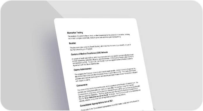 110 Biomarker Testing The analysis of a patient’s tissue, blood, or other biospecimen for the presence of a biomarker, including not limited to single-analyte tests, multiplex panel tests and whole genome sequencing. Booklet This document (also called the Benefit Booklet), which describes the terms of your benefits. It is part of the Plan offered by your Employer. Centers of Medical Excellence (COE) Network A network of health care facilities, which have been selected to give specific services to Members based on their experience, outcomes, efficiency, and effectiveness. A Participating Provider under this Plan is not necessarily a COE. To be a COE, the Provider must have signed a Center of Medical Excellence Agreement with the Claims Administrator. Claims Administrator The company the Employer chose to administer its health benefits. Anthem Insurance Companies, Inc., dba Anthem Blue Cross and Blue Shield was chosen to administer this Plan. The Claims Administrator provides administrative claims payment services only and does not assume any financial risk or obligation with respect to claims. Coinsurance Your share of the cost for Covered Services, which is a percent of the Maximum Allowed Amount. You normally pay Coinsurance after you meet your Deductible. For example, if your Plan lists 20% Coinsurance on office visits, and the Maximum Allowed Amount is $100, your Coinsurance would be $20 after you meet the Deductible. The Plan would then cover the rest of the Maximum Allowed Amount. See the ‘Error! Reference source not found.” for details. Your Coinsurance will not be reduced by any refunds, rebates, or any other form of negotiated post-payment adjustments. Consolidated Appropriations Act of 2021 Please refer to the “Consolidated Appropriations Act of 2021 Notice” at the front of this Booklet for details. Copayment A fixed amount you pay toward a Covered Service. You normally have to pay the Copayment when you get health care. The amount can vary by the type of Covered Service you get. For example, you may have to pay a $15 Copayment for an office visit, but a $150 Copayment for Emergency Room Services. See the ‘Error! Reference source not found.” for details. Your Copayment will be the lesser of the amount shown in the Schedule of Benefits and the Maximum Allowed Amount. Covered Procedure Please see the “Human Organ and Tissue Transplant (Bone Marrow / Stem Cell), Cellular and Gene Therapy Services” benefit in the “What’s Covered” section. Covered Services
