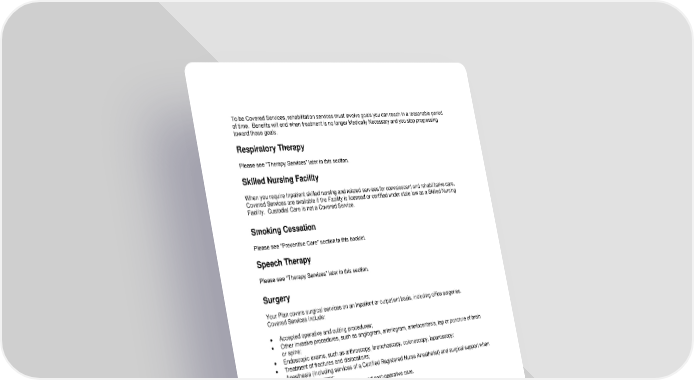 55 To be Covered Services, rehabilitation services must involve goals you can reach in a reasonable period of time. Benefits will end when treatment is no longer Medically Necessary and you stop progressing toward those goals. Respiratory Therapy Please see “Therapy Services” later in this section. Skilled Nursing Facility When you require Inpatient skilled nursing and related services for convalescent and rehabilitative care, Covered Services are available if the Facility is licensed or certified under state law as a Skilled Nursing Facility. Custodial Care is not a Covered Service. Smoking Cessation Please see “Preventive Care” section in this booklet. Speech Therapy Please see “Therapy Services” later in this section. Surgery Your Plan covers surgical services on an Inpatient or outpatient basis, including office surgeries. Covered Services include: • Accepted operative and cutting procedures; • Other invasive procedures, such as angiogram, arteriogram, amniocentesis, tap or puncture of brain or spine; • Endoscopic exams, such as arthroscopy, bronchoscopy, colonoscopy, laparoscopy; • Treatment of fractures and dislocations; • Anesthesia (including services of a Certified Registered Nurse Anesthetist) and surgical support when Medically Necessary; • Medically Necessary pre-operative and post-operative care. Oral Surgery Important Note: Although this Plan covers certain oral surgeries, many oral surgeries (e.g. removal of wisdom teeth) are not covered. Benefits are limited to certain oral surgeries including: • Treatment of medically diagnosed cleft lip, cleft palate, or ectodermal dysplasia; • Orthognathic surgery for a physical abnormality that prevents normal function of the upper and/or lower jaw and is Medically Necessary to attain functional capacity of the affected part. • Oral / surgical correction of accidental injuries as indicated in the “Dental Services” section. • Treatment of non-dental lesions, such as removal of tumors and biopsies. • Incision and drainage of infection of soft tissue not including odontogenic cysts or abscesses.