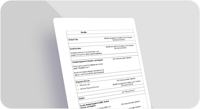 16 Benefits Clinical Trials Benefits are based on the setting in which Covered Services are received. Dental Services (Limited to services for accidental injury, or to prepare the mouth for certain medical treatments) Benefits are based on the setting in which Covered Services are received. Diabetes Equipment, Education, and Supplies Screenings for gestational diabetes are covered under “Preventive Care.” Benefits for diabetic education are based on the setting in which Covered Services are received. 20% Coinsurance after Deductible Diagnostic Services • Reference Labs 20% Coinsurance after Deductible • All Other Diagnostic Services Benefits are based on the setting in which Covered Services are received. Dialysis See “Therapy Services.” Durable Medical Equipment (DME), Medical Devices, and Supplies • Durable Medical Equipment (DME) and Medical Devices 20% Coinsurance after Deductible • Orthotics 20% Coinsurance after Deductible • Prosthetics 20% Coinsurance after Deductible • Medical and Surgical Supplies 20% Coinsurance after Deductible The cost-shares listed above apply when your Provider submits separate bills for the equipment or supplies. Prosthetic limbs (artificial leg or arm) or an Orthotic custom fabricated brace or support designed as a component for a Prosthetic limb are covered the same as any other Medically Necessary items and services and will be subject to the same annual Deductible, Coinsurance, and Copayment as any other service under this Plan. • Wigs Needed After Cancer Treatment Benefit Maximum One wig per Benefit Period