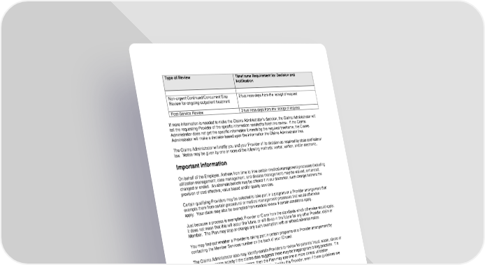 34 Type of Review Timeframe Requirement for Decision and Notification Non-urgent Continued/Concurrent Stay Review for ongoing outpatient treatment 2 business days from the receipt of request Post-Service Review 2 business days from the receipt of request If more information is needed to make the Claims Administrator’s decision, the Claims Administrator will tell the requesting Provider of the specific information needed to finish the review. If the Claims Administrator does not get the specific information it needs by the required timeframe, the Claims Administrator will make a decision based upon the information the Claims Administrator has. The Claims Administrator will notify you and your Provider of its decision as required by state and federal law. Notice may be given by one or more of the following methods: verbal, written, and/or electronic. Important Information On behalf of the Employer, Anthem from time to time certain medical management processes (including utilization management, case management, and disease management) may be waived, enhanced, changed or ended. An alternate benefit may be offered if in our discretion, such change furthers the provision of cost effective, value based and/or quality services. Certain qualifying Providers may be selected to take part in a program or a Provider arrangement that exempts them from certain procedural or medical management processes that would otherwise apply. Your claim may also be exempted from medical review if certain conditions apply. Just because a process is exempted, Provider or Claim from the standards which otherwise would apply, it does not mean that this will occur the future, or will do so in the future for any other Provider, claim or Member. The Plan may stop or change any such exemption with or without advance notice. You may find out whether a Provider is taking part in certain programs or a Provider arrangement by contacting the Member Services number on the back of your ID card. The Claims Administrator also may identify certain Providers to review for potential fraud, waste, abuse or other inappropriate activity if the claims data suggests there may be inappropriate billing practices. If a Provider is selected under this program, then the Plan may use one or more clinical utilization management guidelines in the review of claims submitted by this Provider, even if those guidelines are not used for all Providers delivering services to this Plan’s Members. Health Plan Individual Case Management The Claims Administrator’s health plan individual case management programs (Case Management) help coordinate services for Members with health care needs due to serious, complex, and/or chronic health conditions. The Claims Administrator’s programs coordinate benefits and educate Members who agree to take part in the Case Management program to help meet their health-related needs. The Claims Administrator’s Case Management programs are confidential and voluntary and are made available at no extra cost to you. These programs are provided by, or on behalf of and at the request of, your health plan case management staff. These Case Management programs are separate from any Covered Services you are receiving.