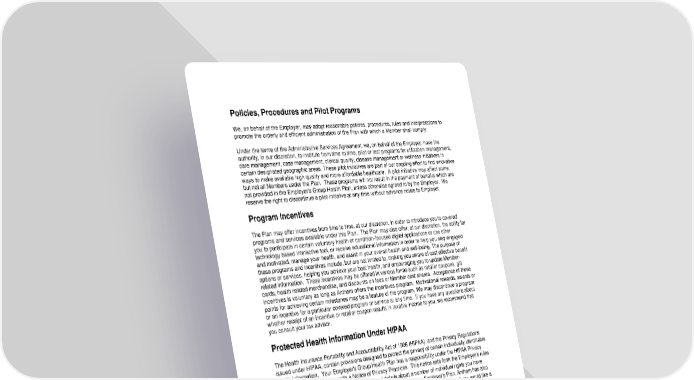 105 Policies, Procedures and Pilot Programs We, on behalf of the Employer, may adopt reasonable policies, procedures, rules and interpretations to promote the orderly and efficient administration of the Plan with which a Member shall comply. Under the terms of the Administrative Services Agreement, we, on behalf of the Employer, have the authority, in our discretion, to institute from time to time, pilot or test programs for utilization management, care management, case management, clinical quality, disease management or wellness initiatives in certain designated geographic areas. These pilot initiatives are part of our ongoing effort to find innovative ways to make available high quality and more affordable healthcare. A pilot initiative may affect some, but not all Members under the Plan. These programs will not result in the payment of benefits which are not provided in the Employer's Group Health Plan, unless otherwise agreed to by the Employer. We reserve the right to discontinue a pilot initiative at any time without advance notice to Employer. Program Incentives The Plan may offer incentives from time to time, at our discretion, in order to introduce you to covered programs and services available under this Plan. The Plan may also offer, at our discretion, the ability for you to participate in certain voluntary health or condition-focused digital applications or use other technology based interactive tool, or receive educational information in order to help you stay engaged and motivated, manage your health, and assist in your overall health and well-being. The purpose of these programs and incentives include, but are not limited to, making you aware of cost effective benefit options or services, helping you achieve your best health, and encouraging you to update Member- related information. These incentives may be offered in various forms such as retailer coupons, gift cards, health related merchandise, and discounts on fees or Member cost shares. Acceptance of these incentives is voluntary as long as Anthem offers the incentives program. Motivational rewards, awards or points for achieving certain milestones may be a feature of the program. We may discontinue a program or an incentive for a particular covered program or service at any time. If you have any questions about whether receipt of an incentive or retailer coupon results in taxable income to you, we recommend that you consult your tax advisor. Protected Health Information Under HIPAA The Health Insurance Portability and Accountability Act of 1996 (HIPAA), and the Privacy Regulations issued under HIPAA, contain provisions designed to protect the privacy of certain individually identifiable health information. Your Employer's Group Health Plan has a responsibility under the HIPAA Privacy Regulations to provide you with a Notice of Privacy Practices. This notice sets forth the Employer's rules regarding the disclosure of your information and details about a number of individual rights you have under the Privacy Regulations. As the Claims Administrator of your Employer's Plan, Anthem has also adopted a number of privacy practices and has described those in its Privacy Notice. If you would like a copy of Anthem's Notice, contact the Member Services number on the back of your Identification Card. Relationship of Parties (Employer-Member-Anthem) The Employer is fiduciary agent of the Member. The Claims Administrator’s notice to the Employer will constitute effective notice to the Member. It is the Employer’s duty to notify the Claims Administrator of eligibility data in a timely manner. This Plan is not responsible for payment of Covered Services of Members if the Employer fails to provide the Claims Administrator with timely notification of Member enrollments or terminations.