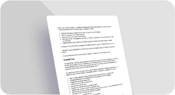 111 Health care services, supplies, or treatment described in this Booklet that are given to you by a Provider. To be a Covered Service the service, supply or treatment must be: • Medically Necessary or specifically included as a benefit under this Booklet. • Within the scope of the Provider’s license. • Given while you are covered under the Plan. • Not Experimental / Investigational, excluded, or limited by this Booklet, or by any amendment or rider to this Booklet. • Approved by the Claims Administrator before you get the service if prior authorization is needed. A charge for a Covered Service will apply on the date the service, supply, or treatment was given to you. The date for applying Deductible and other cost shares for an Inpatient stay is the date of you enter the Facility. Covered Services do not include services or supplies not described in the Provider records. Custodial Care Any type of care, including room and board, that (a) does not require the skills of professional or technical workers; (b) is not given to you or supervised by such workers or does not meet the rules for post- Hospital Skilled Nursing Facility care; (c) is given when you have already reached the greatest level of physical or mental health and are not likely to improve further. Custodial Care includes any type of care meant to help you with activities of daily living that does not require the skill of trained medical or paramedical workers. Examples of Custodial Care include: • Help in walking, getting in and out of bed, bathing, dressing, eating, or using the toilet, • Changing dressings of non-infected wounds, after surgery or chronic conditions, • Preparing meals and/or special diets, • Feeding by utensil, tube, or gastrostomy, • Common skin and nail care, • Supervising medicine that you can take yourself, • Catheter care, general colostomy or ileostomy care, • Routine services which the Plan decides can be safely done by you or a non-medical person without the help of trained medical and paramedical workers, • Residential care and adult day care, • Protective and supportive care, including education, • Rest and convalescent care. Care can be Custodial even if it is recommended by a professional or performed in a Facility, such as a Hospital or Skilled Nursing Facility, or at home. Deductible The amount you must pay for Covered Services before benefits begin under this Plan. For example, if your Deductible is $1,000, your Plan won’t cover anything until you meet the $1,000 Deductible. The Deductible may not apply to all Covered Services. Please see the “Error! Reference source not found.” for details.