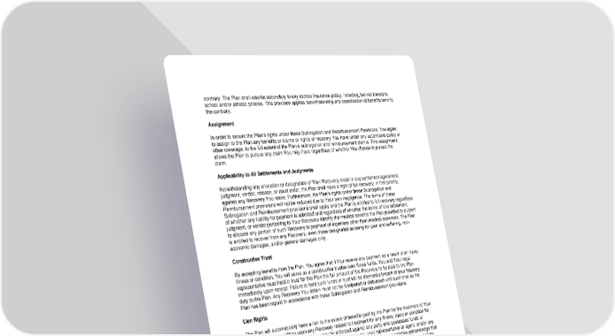 83 contrary. The Plan shall also be secondary to any excess insurance policy, including, but not limited to, school and/or athletic policies. This provision applies notwithstanding any coordination of benefits term to the contrary. Assignment In order to secure the Plan’s rights under these Subrogation and Reimbursement Provisions, You agree to assign to the Plan any benefits or claims or rights of recovery You have under any automobile policy or other coverage, to the full extent of the Plan’s subrogation and reimbursement claims. This assignment allows the Plan to pursue any claim You may have regardless of whether You choose to pursue the claim. Applicability to All Settlements and Judgments Notwithstanding any allocation or designation of Your Recovery made in any settlement agreement, judgment, verdict, release, or court order, the Plan shall have a right of full recovery, in first priority, against any Recovery You make. Furthermore, the Plan’s rights under these Subrogation and Reimbursement provisions will not be reduced due to Your own negligence. The terms of these Subrogation and Reimbursement provisions shall apply and the Plan is entitled to full recovery regardless of whether any liability for payment is admitted and regardless of whether the terms of any settlement, judgment, or verdict pertaining to Your Recovery identify the medical benefits the Plan provided or purport to allocate any portion of such Recovery to payment of expenses other than medical expenses. The Plan is entitled to recover from any Recovery, even those designated as being for pain and suffering, non- economic damages, and/or general damages only. Constructive Trust By accepting benefits from the Plan, You agree that if You receive any payment as a result of an injury, illness or condition, You will serve as a constructive trustee over those funds. You and Your legal representative must hold in trust for the Plan the full amount of the Recovery to be paid to the Plan immediately upon receipt. Failure to hold such funds in trust will be deemed a breach of your fiduciary duty to the Plan. Any Recovery You obtain must not be dissipated or disbursed until such time as the Plan has been repaid in accordance with these Subrogation and Reimbursement provisions. Lien Rights The Plan will automatically have a lien to the extent of benefits paid by the Plan for the treatment of Your illness, injury or condition upon any Recovery related to treatment for any illness, injury or condition for which the Plan paid benefits. The lien may be enforced against any party who possesses funds or proceeds from Your Recovery including, but not limited to, you, your representative or agent, and/or any other source possessing funds from Your Recovery. You and Your legal representative acknowledge that the portion of the Recovery to which the Plan’s equitable lien applies is a Plan asset. The Plan shall be entitled to equitable relief, including without limitation restitution, the imposition of a constructive trust or an injunction, to the extent necessary to enforce the Plan’s lien and/or to obtain (or preclude the transfer, dissipation or disbursement of) such portion of any Recovery in which the Plan may have a right or interest. First-Priority Claim By accepting benefits from the Plan, You acknowledge the Plan’s rights under these Subrogation and Reimbursement provisions are a first priority claim and are to be repaid to the Plan before You receive any Recovery for your damages. The Plan shall be entitled to full reimbursement on a first-dollar basis from any Recovery, even if such payment to the Plan will result in a Recovery which is insufficient to make You whole or to compensate You in part or in whole for the losses, injuries, or illnesses You sustained. The “made-whole” rule does not apply. To the extent that the total assets from which a Recovery is available are insufficient to satisfy in full the Plan's subrogation claim and any claim held by