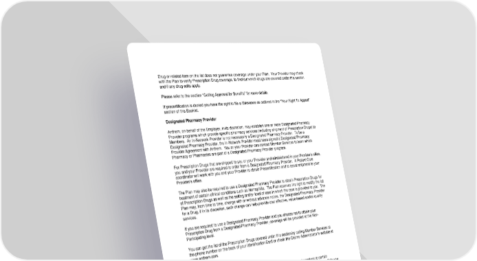 61 Drug or related item on the list does not guarantee coverage under your Plan. Your Provider may check with the Plan to verify Prescription Drug coverage, to find out which drugs are covered under this section and if any drug edits apply. Please refer to the section “Getting Approval for Benefits” for more details. If precertification is denied you have the right to file a Grievance as outlined in the “Your Right To Appeal” section of this Booklet. Designated Pharmacy Provider Anthem, on behalf of the Employer, in its discretion, may establish one or more Designated Pharmacy Provider programs which provide specific pharmacy services (including shipment of Prescription Drugs) to Members. An In-Network Provider is not necessarily a Designated Pharmacy Provider. To be a Designated Pharmacy Provider, the In-Network Provider must have signed a Designated Pharmacy Provider Agreement with Anthem. You or your Provider can contact Member Services to learn which Pharmacy or Pharmacies are part of a Designated Pharmacy Provider program. For Prescription Drugs that are shipped to you or your Provider and administered in your Provider’s office, you and your Provider are required to order from a Designated Pharmacy Provider. A Patient Care coordinator will work with you and your Provider to obtain Precertification and to assist shipment to your Provider’s office. The Plan may also be required to use a Designated Pharmacy Provider to obtain Prescription Drugs for treatment of certain clinical conditions such as Hemophilia. The Plan reserves the right to modify the list of Prescription Drugs as well as the setting and/or level of care in which the care is provided to you. The Plan may, from time to time, change with or without advance notice, the Designated Pharmacy Provider for a Drug, if in its discretion, such change can help provide cost effective, value based and/or quality services. If you are required to use a Designated Pharmacy Provider and you choose not to obtain your Prescription Drug from a Designated Pharmacy Provider, coverage will be provided at the Non- Participating level. You can get the list of the Prescription Drugs covered under this section by calling Member Services at the phone number on the back of your Identification Card or check the Claims Administrator’s website at www.anthem.com. Therapeutic Equivalents Therapeutic equivalents is a program that tells you and your Doctor about alternatives to certain prescribed Drugs. We may contact you and your Doctor to make you aware of these choices. Only you and your Doctor can determine if the therapeutic equivalent is right for you. For questions or issues about therapeutic Drug equivalents call Member Services at the phone number on the back of your Identification Card.