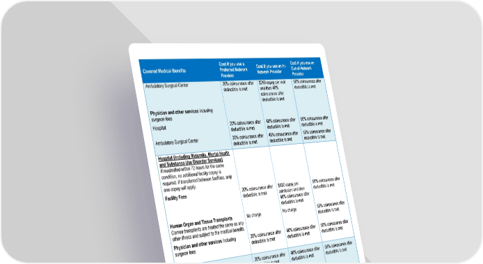 Cost if you use a Cost if you use an In- Cost if you use an Covered Medical Benefits Preferred Network Network Provider Out-of-Network Provider Provider Ambulatory Surgical Center 20% coinsurance after $250 copay per visit 50% coinsurance after deductible is met and then 40% deductible is met coinsurance after deductible is met Physician and other services including surgeon fees Hospital 20% coinsurance after 40% coinsurance after 50% coinsurance after deductible is met deductible is met deductible is met Ambulatory Surgical Center 20% coinsurance after 40% coinsurance after 50% coinsurance after deductible is met deductible is met deductible is met Hospital (Including Maternity, Mental Health and Substance Use Disorder Services) If readmitted within 72 hours for the same condition, no additional facility copay is required. If transferred between facilities, only one copay will apply. Facility Fees 20% coinsurance after $500 copay per 50% coinsurance after deductible is met admission and then deductible is met 40% coinsurance after deductible is met Human Organ and Tissue Transplants No charge No charge 50% coinsurance after Cornea transplants are treated the same as any deductible is met other illness and subject to the medical benefits. Physician and other services including 20% coinsurance after 40% coinsurance after 50% coinsurance after surgeon fees deductible is met deductible is met deductible is met Home Health Care 20% coinsurance after 40% coinsurance after 50% coinsurance after Coverage is limited to 120 visits per benefit deductible is met deductible is met deductible is met period. Limits are combined for all home health services. Rehabilitation and Habilitation services including physical, occupational and speech therapies. Coverage for physical and occupational therapies is limited to 40 visits combined per benefit period. Coverage for speech therapy is limited to 20 visits per benefit period. Office $30 copay per visit $80 copay per visit 50% coinsurance after deductible does not deductible does not deductible is met apply apply Outpatient Hospital 20% coinsurance after 40% coinsurance after 50% coinsurance after deductible is met deductible is met deductible is met Page 4 of 10