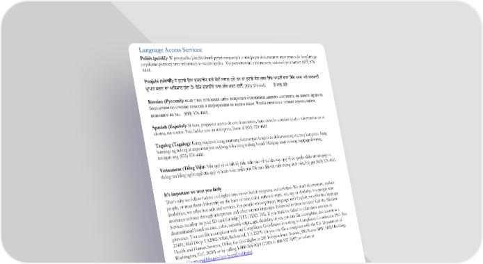 Language Access Services: Polish (polski): W przypadku jakichkolwiek pytań związanych z niniejszym dokumentem masz prawo do bezpłatnego uzyskania pomocy oraz informacji w swoim języku. Aby porozmawiać z tłumaczem, zadzwoń pod numer: (833) 578- 4441. (833) 578-4441 (833) 578-4441. Spanish (Español): Si tiene preguntas acerca de este documento, tiene derecho a recibir ayuda e información en su idioma, sin costos. Para hablar con un intérprete, llame al (833) 578-4441. Tagalog (Tagalog): Kung mayroon kang anumang katanungan tungkol sa dokumentong ito, may karapatan kang humingi ng tulong at impormasyon sa iyong wika nang walang bayad. Makipag-usap sa isang tagapagpaliwanag, tawagan ang (833) 578-4441. Vietnamese (Tiếng Việt): Nếu quý vị có bất kỳ thắc mắc nào về tài liệu này, quý vị có quyền nhận sự trợ giúp và thông tin bằng ngôn ngữ của quý vị hoàn toàn miễn phí. Để trao đổi với một thông dịch viên, hãy gọi (833) 578-4441. It’s important we treat you fairly That’s why we follow federal civil rights laws in our health programs and activities. We don’t discriminate, exclude people, or treat them differently on the basis of race, color, national origin, sex, age or disability. For people with disabilities, we offer free aids and services. For people whose primary language isn’t English, we offer free language assistance services through interpreters and other written languages. Interested in these services? Call the Member Services number on your ID card for help (TTY/TDD: 711). If you think we failed to offer these services or discriminated based on race, color, national origin, age, disability, or sex, you can file a complaint, also known as a grievance. You can file a complaint with our Compliance Coordinator in writing to Compliance Coordinator, P.O. Box 27401, Mail Drop VA2002-N160, Richmond, VA 23279. Or you can file a complaint with the U.S. Department of Health and Human Services, Office for Civil Rights at 200 Independence Avenue, SW; Room 509F, HHH Building; Washington, D.C. 20201 or by calling 1-800-368-1019 (TDD: 1- 800-537-7697) or online at https://ocrportal.hhs.gov/ocr/portal/lobby.jsf. Page 10 of 10