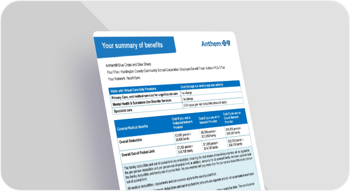 This document provides a summary of health benefits under the Anthem Blue Cross and Blue Shield plan, including details on costs for various types of care and coverage options.