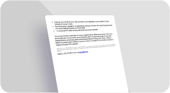 • Costs may vary by the site of service. Other cost shares may apply depending on services provided. Check your Certificate of Coverage for details. • The limits for physical, occupational, and speech therapy, if any apply to this plan, will not apply if you get care as part of the Mental Health and Substance Use Disorder benefit. • ‡ You will pay the PCP's office visit copay when services are provided in their office. This summary of benefits is a brief outline of coverage, designed to help you with the selection process. This summary does not reflect each and every benefit, exclusion and limitation which may apply to the coverage. For more details, important limitations and exclusions, please review the formal Evidence of Coverage (EOC). If there is a difference between this summary and the Certificate of Insurance or Evidence of Coverage (EOC), the Certificate of Insurance or Evidence of Coverage (EOC), will prevail. Anthem Blue Cross and Blue Shield is the trade name of Anthem Health Plans, Inc. Independent licensee of the Blue Cross and Blue Shield Association. ® ANTHEM is a registered trademark of Anthem Insurance Companies, Inc. The Blue Cross and Blue Shield names and symbols are registered marks of the Blue Cross and Blue Shield Association. Questions: (833) 578-4441 or visit us at www.anthem.com Page 7 of 10