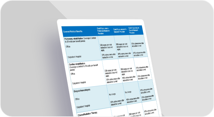Cost if you use a Cost if you use an In- Cost if you use an Covered Medical Benefits Preferred Network Network Provider Out-of-Network Provider Provider Pulmonary rehabilitation Coverage is limited to 20 visits per benefit period. Office $30 copay per visit $80 copay per visit 50% coinsurance after deductible does not deductible does not deductible is met apply apply Outpatient Hospital 20% coinsurance after 40% coinsurance after 50% coinsurance after deductible is met deductible is met deductible is met Cardiac rehabilitation Coverage is limited to 36 visits per benefit period. Office $30 copay per visit $80 copay per visit 50% coinsurance after deductible does not deductible does not deductible is met apply apply Outpatient Hospital 20% coinsurance after 40% coinsurance after 50% coinsurance after deductible is met deductible is met deductible is met Dialysis/Hemodialysis Office No charge No charge 50% coinsurance after deductible is met Outpatient Hospital 20% coinsurance after 40% coinsurance after 50% coinsurance after deductible is met deductible is met deductible is met Chemo/Radiation Therapy Office $30 copay per visit $80 copay per visit 50% coinsurance after deductible does not deductible does not deductible is met ‡ ‡ apply apply Outpatient Hospital 20% coinsurance after 40% coinsurance after 50% coinsurance after deductible is met deductible is met deductible is met Skilled Nursing Care (facility) 20% coinsurance after $500 copay per 50% coinsurance after Coverage for Skilled Nursing, Outpatient deductible is met admission and then deductible is met Rehabilitation and Inpatient Rehabilitation 40% coinsurance after facility settings is limited to 150 days combined deductible is met per benefit period. Inpatient Hospice No charge No charge No charge Durable Medical Equipment 20% coinsurance after 40% coinsurance after 50% coinsurance after deductible is met deductible is met deductible is met Page 5 of 10