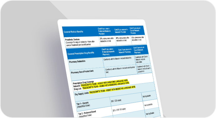 Cost if you use a Cost if you use an In- Cost if you use an Covered Medical Benefits Preferred Network Network Provider Out-of-Network Provider Provider Prosthetic Devices 20% coinsurance after 40% coinsurance after 50% coinsurance after Coverage for wigs is limited to 1 item after deductible is met deductible is met deductible is met cancer treatment per benefit period. Cost if you use a Cost if you use an In- Cost if you use an Covered Prescription Drug Benefits Preferred Network Network Pharmacy Out-of-Network Pharmacy Pharmacy Pharmacy Deductible Combined with In-Network medical deductible Combined with Out-of- Network medical deductible Pharmacy Out-of-Pocket Limit Combined with In-Network medical out-of-pocket Combined with Out-of- limit Network medical out-of- pocket limit Prescription Drug Coverage Network: TRUESCRIPTS TEAM – ASSIST WITH INSERTING LANGUAGE HERE Drug List: TRUESCRIPTS TEAM – ASSIST WITH INSERTING LANGUAGE HERE Day Supply Limits: TRUESCRIPTS TEAM – ASSIST WITH INSERTING LANGUAGE HERE Tier 1 – Generic $10 / $25 copay Not Applicable (Retail/Mail Order) Tier 2 - Preferred Brand $75 / $187.50 copay Not Applicable (Retail/Mail Order) Tier 3 - Non-Preferred Brand $150 / $375 copay Not Applicable (Retail/Mail Order) Tier 4 - Specialty $400 copay Not Applicable (Retail/Mail Order) Notes: • Dependent Age Limit: to the end of the month in which the child attains age 26. • Members are encouraged to always obtain prior approval when using Out-of-Network Providers. Precertification will help the member know if the services are considered not medically necessary. • No charge means no deductible / copayment / coinsurance up to the maximum allowable amount. 0% means no coinsurance up to the maximum allowable amount. However, when choosing an Out-of-Network Provider, the member is responsible for any balance due after the plan payment. • If you have an office visit with your Primary Care Physician or Specialist at an Outpatient Facility (e.g., Hospital or Ambulatory Surgical Facility), benefits for Covered Services will be paid under “Outpatient Facility Services”. Page 6 of 10