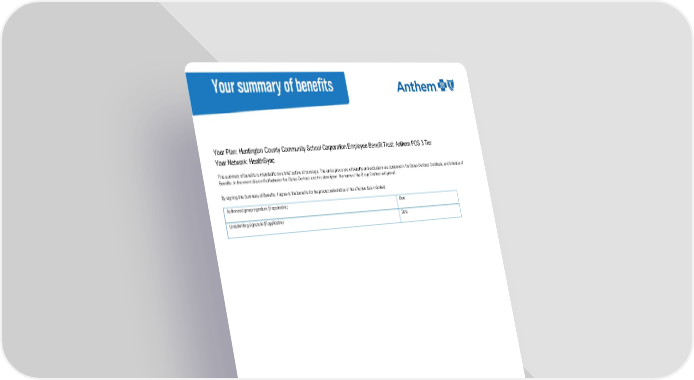 Your Plan: Huntington County Community School Corporation Employee Benefit Trust: Anthem POS 3 Tier Your Network: HealthSync This summary of benefits is intended to be a brief outline of coverage. The entire provisions of benefits and exclusions are contained in the Group Contract, Certificate, and Schedule of Benefits. In the event of a conflict between the Group Contract and this description, the terms of the Group Contract will prevail. By signing this Summary of Benefits, I agree to the benefits for the product selected as of the effective date indicated. Authorized group signature (if applicable) Date Underwriting signature (if applicable) Date IN/LG/Anthem POS 3 Tier/8X5X/01-01-2025 Page 8 of 10
