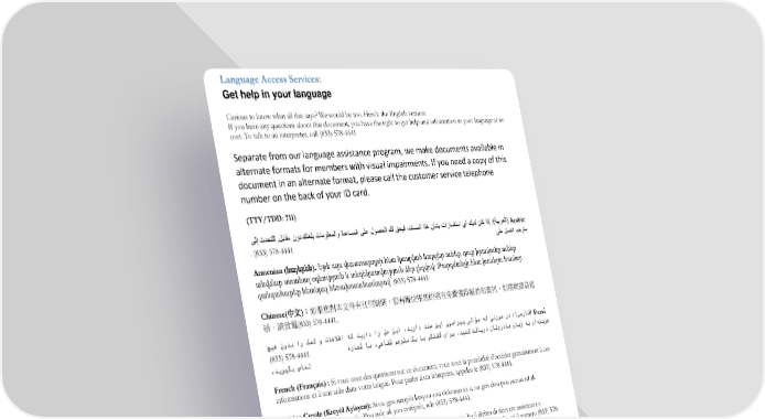 Language Access Services: Get help in your language Curious to know what all this says? We would be too. Here’s the English version: If you have any questions about this document, you have the right to get help and information in your language at no cost. To talk to an interpreter, call (833) 578-4441 Separate from our language assistance program, we make documents available in alternate formats for members with visual impairments. If you need a copy of this document in an alternate format, please call the customer service telephone number on the back of your ID card. (TTY/TDD: 711) . (833) 578-4441 Armenian (հայերեն). Եթե այս փաստաթղթի հետ կապված հարցեր ունեք, դուք իրավունք ունեք անվճար ստանալ օգնություն և տեղեկատվություն ձեր լեզվով: Թարգմանչի հետ խոսելու համար զանգահարեք հետևյալ հեռախոսահամարով՝ (833) 578-4441: Chinese(中文):如果您對本文件有任何疑問,您有權使用您的語言免費獲得協助和資訊。如需與譯員通 話,請致電(833) 578-4441。 (833) 578-4441 French (Français) : Si vous avez des questions sur ce document, vous avez la possibilité d’accéder gratuitement à ces informations et à une aide dans votre langue. Pour parler à un interprète, appelez le (833) 578-4441. Haitian Creole (Kreyòl Ayisyen): Si ou gen nenpòt kesyon sou dokiman sa a, ou gen dwa pou jwenn èd ak enfòmasyon nan lang ou gratis. Pou pale ak yon entèprèt, rele (833) 578-4441. Italian (Italiano): In caso di eventuali domande sul presente documento, ha il diritto di ricevere assistenza e informazioni nella sua lingua senza alcun costo aggiuntivo. Per parlare con un interprete, chiami il numero (833) 578- 4441. (833) 578-4441 Korean (한국어): 본 문서에 대해 어떠한 문의사항이라도 있을 경우, 귀하에게는 귀하가 사용하는 언어로 무료 도움 및 정보를 얻을 권리가 있습니다. 통역사와 이야기하려면(833) 578-4441로 문의하십시오. (833) 578-4441. Page 9 of 10
