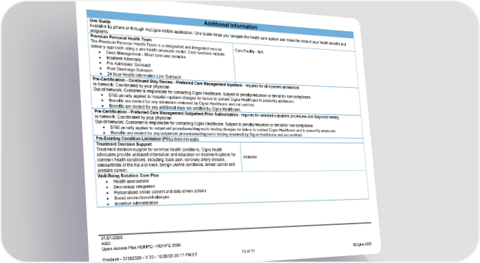 01/01/2026 ASO Open Access Plus HDHPQ - HDHPQ 3500 Proclaim - 37302326 - V 33 - 10/20/25 05:17 PM ET 13 of 17 ©Cigna 2025 Additional Information One Guide Available by phone or through myCigna mobile application. One Guide helps you navigate the health care system and make the most of your health benefits and programs. Premium Personal Health Team The Premium Personal Health Team is a designated and integrated service delivery approach using a one health advocate model. Core functions include: Case Management - Short term and complex Inpatient Advocacy Pre Admission Outreach Post Discharge Outreach 24 hour Health Information Line Outreach Care Facility - N/A Pre-Certification - Continued Stay Review - Preferred Care Management Inpatient - required for all inpatient admissions In-Network: Coordinated by your physician Out-of-Network: Customer is responsible for contacting Cigna Healthcare. Subject to penalty/reduction or denial for non-compliance. $750 penalty applied to hospital inpatient charges for failure to contact Cigna Healthcare to precertify admission. Benefits are denied for any admission reviewed by Cigna Healthcare and not certified. Benefits are denied for any additional days not certified by Cigna Healthcare. Pre-Certification - Preferred Care Management Outpatient Prior Authorization - required for selected outpatient procedures and diagnostic testing In-Network: Coordinated by your physician Out-of-Network: Customer is responsible for contacting Cigna Healthcare. Subject to penalty/reduction or denial for non-compliance. $750 penalty applied to outpatient procedures/diagnostic testing charges for failure to contact Cigna Healthcare and to precertify admission. Benefits are denied for any outpatient procedures/diagnostic testing reviewed by Cigna Healthcare and not certified. Pre-Existing Condition Limitation (PCL) does not apply. Treatment Decision Support Treatment decision support for common health conditions. Cigna health advocates provide unbiased information and education on treatment options for common health conditions, including: back pain, coronary artery disease, osteoarthritis of the hip and knee, benign uterine conditions, breast cancer and prostate cancer. Included Well-Being Solution: Core Plus Health assessment Device/app integration Personalized online content and data-driven actions Social connections/challenges Incentive administration