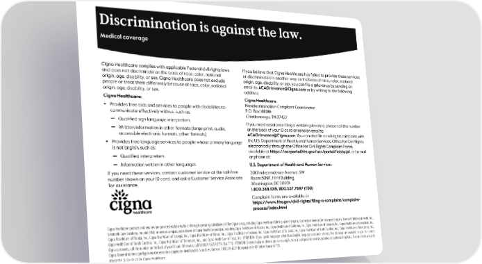 Discrimination is against the law. Medical coverage Cigna Healthcare complies with applicable Federal civil rights laws and does not discriminate on the basis of race, color, national origin, age, disability, or sex. Cigna Healthcare does not exclude people or treat them differently because of race, color, national origin, age, disability, or sex. Cigna Healthcare: • Provides free aids and services to people with disabilities to communicate effectively with us, such as: Qualified sign language interpreters Written information in other formats (large print, audio, accessible electronic formats, other formats) • Provides free language services to people whose primary language is not English, such as: Qualified interpreters Information written in other languages If you need these services, contact customer service at the toll-free number shown on your ID card, and ask a Customer Service Associate for assistance. If you believe that Cigna Healthcare has failed to provide these services or discriminated in another way on the basis of race, color, national origin, age, disability, or sex, you can file a grievance by sending an email to ACAGrievance@Cigna.com or by writing to the following address: Cigna Healthcare Nondiscrimination Complaint Coordinator P.O. Box 188016 Chattanooga, TN 37422 If you need assistance filing a written grievance, please call the number on the back of your ID card or send an email to ACAGrievance@Cigna.com. You can also file a civil rights complaint with the U.S. Department of Health and Human Services, Office for Civil Rights electronically through the Office for Civil Rights Complaint Portal, available at https://ocrportal.hhs.gov/ocr/portal/lobby.jsf, or by mail or phone at: U.S. Department of Health and Human Services 200 Independence Avenue, SW Room 509F, HHH Building Washington, DC 20201 1.800.368.1019, 800.537.7697 (TDD) Complaint forms are available at https://www.hhs.gov/civil-rights/filing-a-complaint/complaint- process/index.html 896375f 3/24 © 2024 Cigna Healthcare