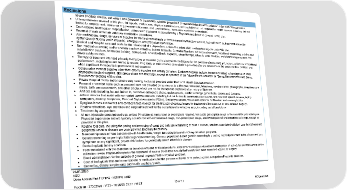 01/01/2026 ASO Open Access Plus HDHPQ - HDHPQ 3500 Proclaim - 37302326 - V 33 - 10/20/25 05:17 PM ET 16 of 17 ©Cigna 2025 Exclusions severe (morbid) obesity; and weight loss programs or treatments, whether prescribed or recommended by a Physician or under medical supervision. Unless otherwise covered in this plan, for reports, evaluations, physical examinations, or hospitalization not required for health reasons including, but not limited to, employment, insurance or government licenses, and court-ordered, forensic or custodial evaluations. Court-ordered treatment or hospitalization, unless such treatment is prescribed by a Physician and listed as covered in this plan. Reversal of male or female voluntary sterilization procedures. Any medications, drugs, services or supplies for the treatment of male or female sexual dysfunction such as, but not limited to, treatment of erectile dysfunction (including penile implants), anorgasmy, and premature ejaculation. Medical and Hospital care and costs for the infant child of a Dependent, unless this infant child is otherwise eligible under this plan. Non-medical counseling and/or ancillary services including, but not limited to, Custodial Services, educational services, vocational counseling, training and rehabilitation services, behavioral training, biofeedback, neurofeedback, hypnosis, sleep therapy, return to work services, work hardening programs and driver safety courses. Therapy or treatment intended primarily to improve or maintain general physical condition or for the purpose of enhancing job, school, athletic or recreational performance, including but not limited to routine, long term, or maintenance care which is provided after the resolution of the acute medical problem and when significant therapeutic improvement is not expected. Consumable medical supplies other than ostomy supplies and urinary catheters. Excluded supplies include, but are not limited to bandages and other disposable medical supplies, skin preparations and test strips, except as specified in the "Home Health Services" or "Breast Reconstruction and Breast Prostheses" sections of this plan. Private Hospital rooms and/or private duty nursing except as provided under the Home Health Services provision. Personal or comfort items such as personal care kits provided on admission to a Hospital, television, telephone, newborn infant photographs, complimentary meals, birth announcements, and other articles which are not for the specific treatment of an Injury or Sickness. Artificial aids including, but not limited to, corrective orthopedic shoes, arch supports, elastic stockings, garter belts, corsets and dentures. Aids or devices that assist with non-verbal communications, including but not limited to communication boards, pre-recorded speech devices, laptop computers, desktop computers, Personal Digital Assistants (PDAs), Braille typewriters, visual alert systems for the deaf and memory books. Eyeglass lenses and frames and contact lenses (except for the first pair of contact lenses for treatment of keratoconus or post cataract surgery). Routine refractions, eye exercises and surgical treatment for the correction of a refractive error, including radial keratotomy. Treatment by acupuncture. All non-injectable prescription drugs, unless Physician administration or oversight is required, injectable prescription drugs to the extent they do not require Physician supervision and are typically considered self-administered drugs, non-prescription drugs, and investigational and experimental drugs, except as provided in this plan. Routine foot care, including the paring and removing of corns and calluses or trimming of nails. However, services associated with foot care for diabetes and peripheral vascular disease are covered when Medically Necessary. Membership costs or fees associated with health clubs, weight loss programs and smoking cessation programs. Genetic screening or pre-implantations genetic screening. General population-based genetic screening is a testing method performed in the absence of any symptoms or any significant, proven risk factors for genetically linked inheritable disease. Dental implants for any condition. Fees associated with the collection or donation of blood or blood products, except for autologous donation in anticipation of scheduled services where in the utilization review Physician's opinion the likelihood of excess blood loss is such that transfusion is an expected adjunct to surgery. Blood administration for the purpose of general improvement in physical condition. Cost of biologicals that are immunizations or medications for the purpose of travel, or to protect against occupational hazards and risks. Cosmetics, dietary supplements and health and beauty aids.