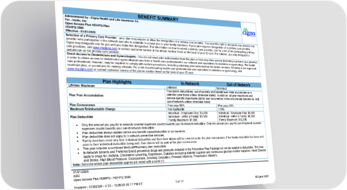 01/01/2026 ASO Open Access Plus HDHPQ - HDHPQ 3500 Proclaim - 37302326 - V 33 - 10/20/25 05:17 PM ET 2 of 17 ©Cigna 2025 Plan Highlights In-Network Out-of-Network Plan Out-of-Pocket Maximum Individual - Employee Only: $5,000 Individual - within a Family: $5,000 Family Maximum: $10,000 Individual - Employee Only: $10,000 Individual - within a Family: $10,000 Family Maximum: $20,000 Only the amount you pay for in-network covered expenses counts toward your in-network out-of-pocket maximum. Only the amount you pay for out-of- network covered expenses counts toward your out-of-network out-of-pocket maximum. Plan deductible contributes towards your out-of-pocket maximum. All benefit copays/deductibles contribute towards your out-of-pocket maximum. Covered expenses that count towards your out-of-pocket maximum include customer paid coinsurance and charges for Mental Health and Substance Use Disorder. Out-of-network non-compliance penalties or charges in excess of Maximum Reimbursable Charge do not contribute towards the out-of-pocket maximum. After each eligible family member meets his or her individual out-of-pocket maximum, the plan will pay 100% of their covered expenses. Or, after the family out-of-pocket maximum has been met, the plan will pay 100% of each eligible family member's covered expenses. This plan includes a combined Medical/Pharmacy out-of-pocket maximum. Benefit In-Network Out-of-Network Note: Services where plan deductible applies are noted with a caret (^). Plan deductible always applies before benefit copays/deductibles. Physician Services - Office Visits Primary Care Physician (PCP) Services/Office Visit Plan pays 80% ^ Plan pays 50% ^ Specialty Care Physician Services/Office Visit Plan pays 80% ^ Plan pays 50% ^ NOTE: Obstetrician and Gynecologist (OB/GYN) visits are subject to either the PCP or Specialist cost share depending on how the provider contracts with Cigna (i.e. as PCP or as Specialist). Surgery Performed in Physician's Office Covered same as Physician Services - Office Visit Covered same as Physician Services - Office Visit Allergy Treatment/Injections and Allergy Serum Allergy serum dispensed by the physician in the office Covered same as Physician Services - Office Visit Covered same as Physician Services - Office Visit Virtual Care Dedicated Virtual Providers - MDLIVE MDLIVE Urgent Virtual Care Services Plan pays 80% ^ Not Covered MDLIVE Primary Care Services Plan pays 80% ^ Not Covered MDLIVE Specialty Care Services Plan pays 80% ^ Not Covered Primary Care cost share applies to routine care. Virtual wellness screenings are payable under Preventive Care. For MDLIVE Behavioral Services, please refer to the Mental Health and Substance Use Disorder section (below). Lab services supporting a virtual visit must be obtained through dedicated labs. Includes charges for the delivery of medical and health-related services and consultations by dedicated virtual providers as medically appropriate through audio, video, and secure internet-based technologies.