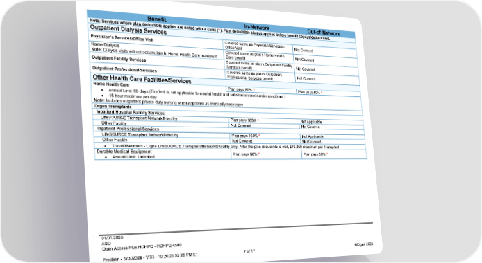 01/01/2026 ASO Open Access Plus HDHPQ - HDHPQ 4500 Proclaim - 37302329 - V 33 - 10/20/25 05:26 PM ET 7 of 17 ©Cigna 2025 Benefit In-Network Out-of-Network Note: Services where plan deductible applies are noted with a caret (^). Plan deductible always applies before benefit copays/deductibles. Outpatient Dialysis Services Physician’s Services/Office Visit Covered same as Physician Services - Office Visit Not Covered Home Dialysis Note: Dialysis visits will not accumulate to Home Health Care maximum Covered same as plan's Home Health Care benefit Not Covered Outpatient Facility Services Covered same as plan's Outpatient Facility Services benefit Not Covered Outpatient Professional Services Covered same as plan’s Outpatient Professional Services benefit Not Covered Other Health Care Facilities/Services Home Health Care Plan pays 80% ^ Plan pays 50% ^ Annual Limit: 60 days (The limit is not applicable to mental health and substance use disorder conditions.) 16 hour maximum per day Note: Includes outpatient private duty nursing when approved as medically necessary Organ Transplants Inpatient Hospital Facility Services LifeSOURCE Transplant Network® facility Plan pays 100% ^ Not Applicable Other Facility Not Covered Not Covered Inpatient Professional Services LifeSOURCE Transplant Network® facility Plan pays 100% ^ Not Applicable Other Facility Not Covered Not Covered Travel Maximum - Cigna LifeSOURCE Transplant Network® facility only: After the plan deductible is met, $10,000 maximum per Transplant Durable Medical Equipment Annual Limit: Unlimited Plan pays 80% ^ Plan pays 50% ^