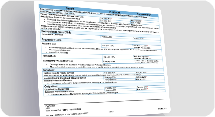 01/01/2026 ASO Open Access Plus HDHPQ - HDHPQ 4500 Proclaim - 37302329 - V 33 - 10/20/25 05:26 PM ET 3 of 17 ©Cigna 2025 Benefit In-Network Out-of-Network Note: Services where plan deductible applies are noted with a caret (^). Plan deductible always applies before benefit copays/deductibles. Virtual Physician Services - Office Visits Primary Care Physician (PCP) Services/Office Visit Plan pays 80% ^ Plan pays 50% ^ Specialty Care Physician Services/Office Visit Plan pays 80% ^ Plan pays 50% ^ Physicians may deliver services virtually that are payable under other benefits (e.g., Preventive Care, Outpatient Therapy Services). Includes charges for the delivery of medical and health-related services and consultations as medically appropriate through audio, video, and secure internet- based technologies that are similar to office visit services provided in a face-to-face setting. NOTE: Obstetrician and Gynecologist (OB/GYN) visits are subject to either the PCP or Specialist cost share depending on how the provider contracts with Cigna (i.e. as PCP or as Specialist). Convenience Care Clinic Convenience Care Clinic Plan pays 80% ^ Plan pays 50% ^ Preventive Care Preventive Care Plan pays 100% PCP: Plan pays 50% ^ Specialist: Plan pays 50% ^ Includes coverage of additional services, such as urinalysis, EKG, and other laboratory tests, supplementing the standard Preventive Care benefit when billed as part of office visit. Annual Limit: Unlimited Immunizations Plan pays 100% PCP: Plan pays 50% ^ Specialist: Plan pays 50% ^ Mammogram, PAP, and PSA Tests Plan pays 100% Covered same as other x-ray and lab services, based on Place of Service Coverage includes the associated Preventive Outpatient Professional Services. Diagnostic-related services are covered at the same level of benefits as other x-ray and lab services, based on Place of Service. Inpatient Inpatient Hospital Facility Services Plan pays 80% ^ Plan pays 50% ^ Note: Includes all Lab and Radiology services, including Advanced Radiological Imaging as well as Medical Pharmaceutical Drugs Inpatient Hospital Physician's Visit/Consultation Plan pays 80% ^ Plan pays 50% ^ Inpatient Professional Services Plan pays 80% ^ Plan pays 50% ^ For services performed by Surgeons, Radiologists, Pathologists and Anesthesiologists Outpatient Outpatient Facility Services Plan pays 80% ^ Plan pays 50% ^ Outpatient Professional Services Plan pays 80% ^ Plan pays 50% ^ For services performed by Surgeons, Radiologists, Pathologists and Anesthesiologists