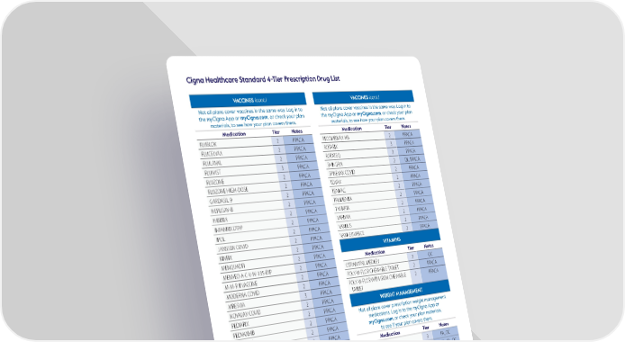 27 Cigna Healthcare Standard 4-Tier Prescription Drug List Generic medications are listed in all lowercase letters and brand-name medications are listed in all CAPITAL letters. Tier 1 – Generics PA – Prior Authorization SP – Specialty Medication Tier 2 – Preferred Brands QL – Quantity Limit PPACA – No Cost-Share Preventive Medication Tier 3 – Non-Preferred Brands ST – Step Therapy OC – Optional Coverage Tier 4 – Specialty Medications AGE – Age Requirement VACCINES (cont.) Not all plans cover vaccines in the same way. Log in to the myCigna App or myCigna.com, or check your plan materials, to see how your plan covers them. Medication Tier Notes FLUBLOK 2 PPACA FLUCELVAX 2 PPACA FLULAVAL 2 PPACA FLUMIST 3 PPACA FLUZONE 2 PPACA FLUZONE HIGH-DOSE 2 PPACA GARDASIL 9 2 PPACA HEPLISAV-B 2 PPACA HIBERIX 2 PPACA INFANRIX DTAP 2 PPACA IPOL 2 PPACA JANSSEN COVID 2 PPACA KINRIX 2 PPACA MENQUADFI 2 PPACA MENVEO A-C-Y-W-135-DIP 2 PPACA M-M-R II VACCINE 2 PPACA MODERNA COVID 2 PPACA MRESVIA 3 PPACA NOVAVAX COVID 2 PPACA PEDIARIX 2 PPACA PEDVAXHIB 2 PPACA PENBRAYA 2 PPACA PENMENVY MEN A-B-C-W-Y 2 PPACA PENTACEL 2 PPACA PENTACEL ACTHIB COMPONENT 2 PPACA PFIZER COVID 2 PPACA PNEUMOVAX 23 2 PPACA PREHEVBRIO 2 PPACA PREVNAR 20 2 PPACA PRIORIX 2 PPACA PROQUAD 2 PPACA QUADRACEL DTAP-IPV 2 PPACA VACCINES (cont.) Not all plans cover vaccines in the same way. Log in to the myCigna App or myCigna.com, or check your plan materials, to see how your plan covers them. Medication Tier Notes RECOMBIVAX HB 2 PPACA ROTARIX 3 PPACA ROTATEQ 3 PPACA SHINGRIX 2 QL, PPACA SPIKEVAX COVID 2 PPACA TDVAX 2 PPACA TENIVAC 2 PPACA TRUMENBA 2 PPACA TWINRIX 2 PPACA VARIVAX 2 PPACA VAXELIS 2 PPACA VAXNEUVANCE 2 PPACA VITAMINS Medication Tier Notes CITRANATAL MEDLEY 3 OC POLY-VI-FLOR CHEWABLE TABLET 2 PPACA POLY-VI-FLOR WITH IRON CHEWABLE TABLET 2 PPACA WEIGHT MANAGEMENT Not all plans cover prescription weight management medications. Log in to the myCigna App or myCigna.com, or check your plan materials, to see if your plan covers them. Medication Tier Notes CONTRAVE 3 PA, OC IMCIVREE 4 SP, PA, QL, OC phentermine 1 OC QSYMIA 3 PA, OC SAXENDA 2 PA, OC WEGOVY 2 PA, QL, OC ZEPBOUND PEN 2 PA, QL, OC