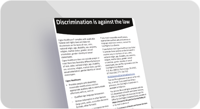 Cigna Healthcare® complies with applicable Federal civil rights laws and does not discriminate on the basis of race, color, national origin, age, disability, sex, ancestry, religion, marital status, gender, sexual orientation, gender identity or sexual stereotypes. Cigna Healthcare does not exclude people or treat them less favorably differently because of race, color, national origin, age, disability, sex, ancestry, religion, marital status, gender, sexual orientation, gender identity or sexual stereotypes. Cigna Healthcare: • Provides people with disabilities reasonable modifications and free appropriate auxiliary aids to communicate effectively with us, such as: – Qualified sign language interpreters – Written information in other formats (large print, audio, accessible electronic formats, other formats) • Provides free language assistance services to people whose primary language is not English in a timely manner, such as: – Qualified interpreters – Information written in other languages If you need reasonable modifications, appropriate auxiliary aids and services or language assistance services, contact the Civil Rights Coordinator. If you believe that Cigna Healthcare has failed to provide these services or discriminated in another way on the basis of race, color, national origin, age, disability, sex, ancestry, religion, marital status, gender, sexual orientation, gender identity or sexual stereotypes, you can file a grievance with the Civil Rights Coordinator P.O. Box 188016, Chattanooga, TN 37422, 877.822.6561 (TTY: Dial 711) ACAGrievance@CignaHealthcare.com You can file a grievance in person or by mail, fax, or email. If you need help filing a grievance, the Civil Rights Coordinator is available to help you. You can also file a civil rights complaint with the U.S. Department of Health and Human Services, Office for Civil Rights electronically through the Office for Civil Rights Complaint Portal, available at https://ocrportal.hhs.gov/ocr/portal/lobby.jsf, or by mail or phone at: U.S. Department of Health and Human Services 200 Independence Avenue, SW Room 509F, HHH Building Washington, DC 20201 1.800.368.1019, 800.537.7697 (TDD) Complaint forms are available at https://www.hhs.gov/civil-rights/filing-a- complaint/complaint-process/index.html Cigna Healthcare products and services are provided exclusively by or through operating subsidiaries of The Cigna Group, including Cigna Health and Life Insurance Company, Connecticut General Life Insurance Company, Evernorth Behavioral Health, Inc., Evernorth Care Solutions, Inc. and HMO or service company subsidiaries of Cigna Health Corporation, including Cigna HealthCare of Arizona, Inc. Cigna HealthCare of California, Inc. Cigna HealthCare of Colorado, Inc. Cigna HealthCare of Connecticut, Inc. Cigna HealthCare of Florida, Inc. Cigna HealthCare of Georgia, Inc. Cigna HealthCare of Illinois, Inc., Cigna HealthCare of Indiana, Inc., Cigna HealthCare of St. Louis, Inc., Cigna HealthCare of North Carolina, Inc., Cigna HealthCare of New Jersey, Inc., Cigna HealthCare of South Carolina, Inc., Cigna HealthCare of Tennessee, Inc., and Cigna HealthCare of Texas, Inc. ATTENTION: If you speak languages other than English, language assistance service, free of charge are available to you. For current Cigna Healthcare customers, call the number on the back of your ID card. Otherwise, call 1.800.244.6224 (TTY: Dial 711). ATENCIÓN: Si usted habla un idioma que no sea inglés, tiene a su disposición servicios gratuitos de asistencia lingüística. Si es un cliente actual de Cigna 896375h 5/25 © 2025 Cigna Healthcare. Discrimination is against the law