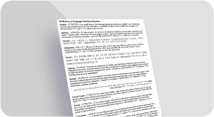 824711 8/24 Proficiency of Language Assistance Services English – ATTENTION: If you speak English, free language assistance services are available to you. Appropriate auxiliary aids and services to provide information in accessible formats are also available free of charge. Call 1- 800-244-6224 (TTY: Dial 711) or speak to your provider. Spanish – ATENCIÓN: Si habla español, los servicios de asistencia lingüística gratuitos están disponibles para usted. También están disponibles de forma gratuita ayudas y servicios auxiliares adecuados para proporcionar información en formatos accesibles. Llame al 1-800-244-6224 (TTY: Marque 711) o hable con su proveedor. Chinese – 注意:如果您讲中文,我们提供免费的语言援助服务。适当的辅助设备和服务也可以免费提供,以提供无 障碍格式的信息。请拨打 1-800-244-6224(TTY:拨打 711)或与您的服务提供者联系。 Vietnamese – XIN LƯU Ý: Nếu bạn nói tiếng Viet, dịch vụ hỗ trợ ngôn ngữ miễn phí có sẵn cho bạn. Các thiết bị và dịch vụ hỗ trợ phù hợp để cung cấp thông tin ở định dạng có thể tiếp cận cũng có sẵn miễn phí. Gọi số 1-800-244-6224 (TTY: Gọi 711) hoặc nói chuyện với nhà cung cấp của bạn). Korean – 주의: 한국어를 사용하시는 경우, 무료 언어 지원 서비스가 제공됩니다. 접근 가능한 형식으로 정보를 제공하기 위한 적절한 보조 기기 및 서비스도 무료로 제공됩니다. 1-800-244-6224 (TTY: 711 로 전화) 로 전화하시거나 제공자에게 문의하십 시오. Tagalog – PAUNAWA: Kung ikaw ay nagsasalita ng Tagalog, ang mga libreng serbisyo ng tulong sa wika ay magagamit para sa iyo. Ang mga angkop na pantulong na kagamitan at serbisyo upang magbigay ng impormasyon sa mga naa-access na format ay magagamit din ng libre. Tumawag sa 1-800-244-6224 (TTY: Tumawag sa 711) o makipag-usap sa iyong tagapagbigay. Russian – ВНИМАНИЕ: Если вы говорите на русском, доступны бесплатные услуги языковой помощи. Также бесплатно предоставляются соответствующие вспомогательные средства и услуги для предоставления информации в доступных форматах. Позвоните по телефону 1-800-244-6224 (TTY: Наберите 711) или обратитесь к вашему провайдеру. - Arabic ﮫﯾﺑﻧﺗ: اذإ ثدﺣﺗﺗ تﻧﻛ ،ﺔﯾﺑرﻌﻟا رﻓوﺗﺗ كﻟ تﺎﻣدﺧ ةدﻋﺎﺳﻣﻟا ﺔﯾوﻐﻠﻟا ﺔﯾﻧﺎﺟﻣﻟا. ﺎﻣﻛ رﻓوﺗﺗ ﺎًﺿﯾأ تادﻋﺎﺳﻣ ﺔﻠﺑﺎﻗ لوﺻوﻠﻟ ،ﺎﮭﯾﻟإ كﻟذو ﺎًﻧﺎﺟﻣ. لﺻﺗا مﻗرﻟﺎﺑ .وأ ثدﺣﺗ ﻰﻟإ مدﻘﻣ ﺔﻣدﺧﻟا صﺎﺧﻟا كﺑ ) بﻠطا 711 (TTY: 6224 - 244 - 800 - 1 French Creole – ATANSYON: Si ou pale Kreyòl Ayisyen, sèvis asistans lang gratis yo disponib pou ou. Ekipman ak sèvis adisyonèl ki apwopriye pou bay enfòmasyon nan fòma ki aksesib yo disponib tou gratis. Rele 1-800-244- 6224 (TTY: Rele 711) oswa pale ak founisè ou a. French – ATTENTION : Si vous parlez français, des services d’assistance linguistique gratuits sont disponibles pour vous. Des aides et des services auxiliaires appropriés pour fournir des informations dans des formats accessibles sont également disponibles gratuitement. Appelez le 1-800-244-6224 (TTY : composez le 711) ou parlez à votre fournisseur. Portuguese – ATENÇÃO: Se você fala português, serviços gratuitos de assistência linguística estão disponíveis para você. Auxílios e serviços apropriados para fornecer informações em formatos acessíveis também estão disponíveis gratuitamente. Ligue para 1-800-244-6224 (TTY: disque 711) ou fale com seu prestador de serviços. Polish – UWAGA: Jeśli mówisz po polsku, dostępne są bezpłatne usługi pomocy językowej. Odpowiednie pomoce i usługi wspierające w celu dostarczenia informacji w dostępnych formatach są również dostępne bezpłatnie. Zadzwoń pod numer 1-800-244-6224 (TTY: wybierz 711) lub skontaktuj się ze swoim dostawcą usług. Japanese – 注意: 日本語を話す場合は、無料の言語支援サービスが利用できます。アクセス可能な形式で情報を 提供するための適切な補助機器やサービスも無料で利用できます。1-800-244-6224(TTY: 711 にダイヤル)に電 話するか、提供者に話してください。 Italian – ATTENZIONE: Se parli italiano, sono disponibili per te servizi gratuiti di assistenza linguistica. Sono disponibili gratuitamente anche ausili e servizi appropriati per fornire informazioni in formati accessibili. Chiama il numero 1-800-244-6224 (TTY: comporre il 711) o parla con il tuo fornitore. German – Achtung: Wenn Sie Deutsch sprechen, stehen Ihnen kostenlose Sprachassistenzdienste zur Verfügung. Geeignete Hilfsmittel und Dienste, um Informationen in barrierefreien Formaten bereitzustellen, sind ebenfalls kostenlos verfügbar. Rufen Sie 1-800-244-6224 an (TTY: Wählen Sie 711) oder sprechen Sie mit Ihrem Anbieter. (Farsi) Persian - ،نﯾﻧﭼﻣھ ﺳو لﯾﺎ و تﺎﻣدﺧ ﯽﮑﻣﮐ بﺳﺎﻧﻣ یارﺑ رد سرﺗﺳد تﺳا. تﺎﻣدﺧ نﺎﮕﯾار ﮏﻣﮐ نﺎﺑز یارﺑ ﺎﻣﺷ تﺑﺣﺻ ﯾﻧﮐﯽﻣ ،د ﮫﺟوﺗ: رﮔا ﮫﺑ ﯽﺳرﺎﻓ ﺎﺑ ﺎﯾ دﯾرﯾﮕﺑ سﺎﻣﺗ) هرﺎﻣﺷ711 دﯾرﯾﮕﺑ ار(TTY: تﺎﻋﻼطا ﮫﺋارا یﺎﮭﺑﻟﺎﻗ رد ﮫﺑ سرﺗﺳد لﺑﺎﻗ رد نﺎﮕﯾار تروﺻسرﺗﺳد دﻧﺗﺳھ. هرﺎﻣﺷ ﺎﺑ 1-800-244-6224 . دﯾﻧﮐ تﺑﺣﺻ دوﺧ هدﻧھدﮫﺋارا