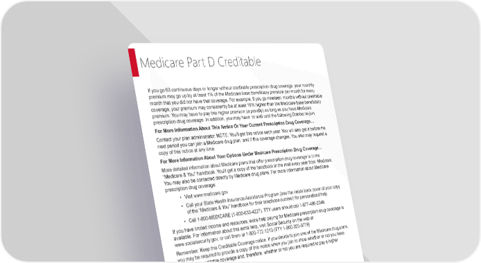 Page 25 | Richmond Community Schools| Plan Year 2026 This Compliance Overview is not intended to be exhaustive nor should any discussion or opinions be construed as legal advice. Readers should contact legal counsel for legal advice. Medicare Part D Creditable If you go 63 continuous days or longer without creditable prescription drug coverage, your monthly premium may go up by at least 1% of the Medicare base beneficiary premium per month for every month that you did not have that coverage. For example, if you go nineteen months without creditable coverage, your premium may consistently be at least 19% higher than the Medicare base beneficiary premium. You may have to pay this higher premium (a penalty) as long as you have Medicare prescription drug coverage. In addition, you may have to wait until the following October to join. For More Information About This Notice Or Your Current Prescription Drug Coverage… Contact your plan administrator. NOTE: You’ll get this notice each year. You will also get it before the next period you can join a Medicare drug plan, and if this coverage changes. You also may request a copy of this notice at any time. For More Information About Your Options Under Medicare Prescription Drug Coverage… More detailed information about Medicare plans that offer prescription drug coverage is in the “Medicare & You” handbook. You’ll get a copy of the handbook in the mail every year from Medicare. You may also be contacted directly by Medicare drug plans. For more information about Medicare prescription drug coverage: • Visit www.medicare.gov • Call your State Health Insurance Assistance Program (see the inside back cover of your copy of the “Medicare & You” handbook for their telephone number) for personalized help • Call 1-800-MEDICARE (1-800-633-4227). TTY users should call 1-877-486-2048. If you have limited income and resources, extra help paying for Medicare prescription drug coverage is available. For information about this extra help, visit Social Security on the web at www.socialsecurity.gov, or call them at 1-800-772-1213 (TTY 1-800-325-0778). Remember: Keep this Creditable Coverage notice. If you decide to join one of the Medicare drug plans, you may be required to provide a copy of this notice when you join to show whether or not you have maintained creditable coverage and, therefore, whether or not you are required to pay a higher premium (a penalty). Date: Name of Entity/Sender: Contact Position/Office: Address: Phone Number: October 1, 2025 Richmond Community Schools Vickie Fisher, HR 300 Hub Etchison Parkway Richmond IN 47374 765-973-3420