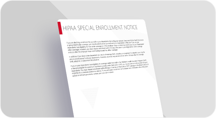Page 8 | Richmond Community Schools| Plan Year 2026 This Compliance Overview is not intended to be exhaustive nor should any discussion or opinions be construed as legal advice. Readers should contact legal counsel for legal advice. HIPAA SPECIAL ENROLLMENT NOTICE If you are declining enrollment for yourself or your dependents (including your spouse) because of other health insurance or group health plan coverage, you may be able to enroll yourself and your dependents in this plan if you or your dependents lose eligibility for that other coverage (or if the employer stops contributing toward your or your dependents’ other coverage). However, you must request enrollment within 30 days after your or your dependents’ other coverage ends (or after the employer stops contributing toward the other coverage). In addition, if you have a new dependent as a result of marriage, birth, adoption, or placement for adoption, you may be able to enroll yourself and your dependents. However, you must request enrollment within 30 days after the marriage, birth, adoption, or placement for adoption. If you or your dependents lose eligibility for coverage under Medicaid or the Children’s Health Insurance Program (CHIP) or become eligible for a premium assistance subsidy under Medicaid or CHIP, you may be able to enroll yourself and your dependents. You must request enrollment within 60 days of the loss of Medicaid or CHIP coverage or the determination of eligibility for a premium assistance subsidy. To request special enrollment or to obtain more information about the plan's special enrollment provisions, contact your plan administrator.