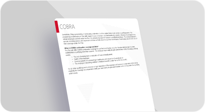 Page 19 | Richmond Community Schools| Plan Year 2026 This Compliance Overview is not intended to be exhaustive nor should any discussion or opinions be construed as legal advice. Readers should contact legal counsel for legal advice. COBRA Sometimes, filing a proceeding in bankruptcy under title 11 of the United States Code can be a qualifying event. If a proceeding in bankruptcy is filed with respect to your employer, and that bankruptcy results in the loss of coverage of any retired employee covered under the Plan, the retired employee will become a qualified beneficiary. The retired employee’s spouse, surviving spouse, and dependent children will also become qualified beneficiaries if bankruptcy results in the loss of their coverage under the Plan. When is COBRA continuation coverage available? The Plan will offer COBRA continuation coverage to qualified beneficiaries only after the plan administrator has been notified that a qualifying event has occurred. The employer must notify the plan administrator of the following qualifying events: • The end of employment or reduction of hours of employment; • Death of the employee; • Commencement of a proceeding in bankruptcy with respect to the employer; or • The employee’s becoming entitled to Medicare benefits (under Part A, Part B, or both). For all other qualifying events (divorce or legal separation of the employee and spouse or a dependent child’s losing eligibility for coverage as a dependent child), you must notify the plan administrator within 60 days after the qualifying event occurs.