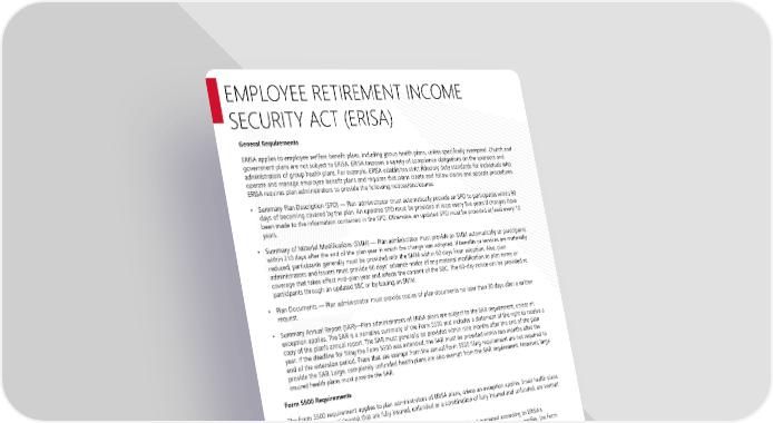 Page 15 | Richmond Community Schools| Plan Year 2026 This Compliance Overview is not intended to be exhaustive nor should any discussion or opinions be construed as legal advice. Readers should contact legal counsel for legal advice. EMPLOYEE RETIREMENT INCOME SECURITY ACT (ERISA) General Requirements ERISA applies to employee welfare benefit plans, including group health plans, unless specifically exempted. Church and government plans are not subject to ERISA. ERISA imposes a variety of compliance obligations on the sponsors and administrators of group health plans. For example, ERISA establishes strict fiduciary duty standards for individuals who operate and manage employee benefit plans and requires that plans create and follow claims and appeals procedures. ERISA requires plan administrators to provide the following notices/disclosures: • Summary Plan Description (SPD) — Plan administrator must automatically provide an SPD to participants within 90 days of becoming covered by the plan. An updated SPD must be provided at least every five years if changes have been made to the information contained in the SPD. Otherwise, an updated SPD must be provided at least every 10 years. • Summary of Material Modifications (SMM) — Plan administrator must provide an SMM automatically to participants within 210 days after the end of the plan year in which the change was adopted. If benefits or services are materially reduced, participants generally must be provided with the SMM within 60 days from adoption. Also, plan administrators and issuers must provide 60 days’ advance notice of any material modification to plan terms or coverage that takes effect mid-plan year and affects the content of the SBC. The 60-day notice can be provided to participants through an updated SBC or by issuing an SMM. • Plan Documents — Plan administrator must provide copies of plan documents no later than 30 days after a written request. • Summary Annual Report (SAR)—Plan administrators of ERISA plans are subject to the SAR requirement, unless an exception applies. The SAR is a narrative summary of the Form 5500 and includes a statement of the right to receive a copy of the plan's annual report. The SAR must generally be provided within nine months after the end of the plan year. If the deadline for filing the Form 5500 was extended, the SAR must be provided within two months after the end of the extension period. Plans that are exempt from the annual Form 5500 filing requirement are not required to provide the SAR. Large, completely unfunded health plans are also exempt from the SAR requirement. However, large insured health plans must provide the SAR. Form 5500 Requirements The Form 5500 requirement applies to plan administrators of ERISA plans, unless an exception applies. Small health plans (fewer than 100 participants) that are fully insured, unfunded or a combination of fully insured and unfunded, are exempt from the Form 5500 filing requirement. The Form 5500 is used to ensure that employee benefit plans are operated and managed according to ERISA’s requirements. The filing requirements vary according to the type of ERISA plan. Unless an extension applies, the Form 5500 must be filed by the last day of the seventh month following the end of the plan year (that is, July 31 of the following year for calendar year plans).