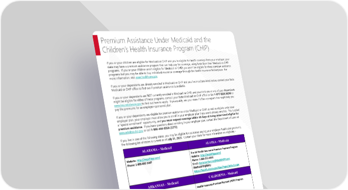 Page 9 | Richmond Community Schools| Plan Year 2026 This Compliance Overview is not intended to be exhaustive nor should any discussion or opinions be construed as legal advice. Readers should contact legal counsel for legal advice. If you or your children are eligible for Medicaid or CHIP and you’re eligible for health coverage from your employer, your state may have a premium assistance program that can help pay for coverage, using funds from their Medicaid or CHIP programs. If you or your children aren’t eligible for Medicaid or CHIP, you won’t be eligible for these premium assistance programs but you may be able to buy individual insurance coverage through the Health Insurance Marketplace. For more information, visit www.healthcare.gov. If you or your dependents are already enrolled in Medicaid or CHIP and you live in a State listed below, contact your State Medicaid or CHIP office to find out if premium assistance is available. If you or your dependents are NOT currently enrolled in Medicaid or CHIP, and you think you or any of your dependents might be eligible for either of these programs, contact your State Medicaid or CHIP office or dial 1-877-KIDS NOW or www.insurekidsnow.gov to find out how to apply. If you qualify, ask your state if it has a program that might help you pay the premiums for an employer-sponsored plan. If you or your dependents are eligible for premium assistance under Medicaid or CHIP, as well as eligible under your employer plan, your employer must allow you to enroll in your employer plan if you aren’t already enrolled. This is called a “special enrollment” opportunity, and you must request coverage within 60 days of being determined eligible for premium assistance. If you have questions about enrolling in your employer plan, contact the Department of Labor at www.askebsa.dol.gov or call 1-866-444-EBSA (3272). If you live in one of the following states, you may be eligible for assistance paying your employer health plan premiums. The following list of states is current as of July 31, 2025. Contact your State for more information on eligibility – Premium Assistance Under Medicaid and the Children’s Health Insurance Program (CHIP) ALABAMA – Medicaid ALASKA – Medicaid Website: http://myalhipp.com/ Phone: 1-855-692-5447 The AK Health Insurance Premium Payment Program Website: http://myakhipp.com/ Phone: 1-866-251-4861 Email: CustomerService@MyAKHIPP.com Medicaid Eligibility: https://health.alaska.gov/dpa/Pages/default.aspx ARKANSAS – Medicaid CALIFORNIA – Medicaid Website: http://myarhipp.com/ Phone: 1-855-MyARHIPP (855-692-7447) Health Insurance Premium Payment (HIPP) Program Website: http://dhcs.ca.gov/hipp Phone: 916-445-8322 Fax: 916-440-5676 Email: hipp@dhcs.ca.gov COLORADO – Health First Colorado (Colorado’s Medicaid Program) & Child Health Plan Plus (CHP+) FLORIDA – Medicaid Health First Colorado Website: https://www.healthfirstcolorado.com/ Health First Colorado Member Contact Center: 1-800-221-3943/State Relay 711 CHP+: https://hcpf.colorado.gov/child-health-plan-plus CHP+ Customer Service: 1-800-359-1991/State Relay 711 Health Insurance Buy-In Program (HIBI): https://www.mycohibi.com/ HIBI Customer Service: 1-855-692-6442 Website: https://www.flmedicaidtplrecovery.com/flmedicaidtplrecov ery.com/hipp/index.html Phone: 1-877-357-3268