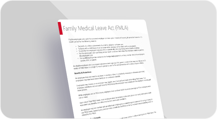 Page 22 | Richmond Community Schools| Plan Year 2026 This Compliance Overview is not intended to be exhaustive nor should any discussion or opinions be construed as legal advice. Readers should contact legal counsel for legal advice. Family Medical Leave Act (FMLA) Eligible employees who work for a covered employer can take up to 12 weeks of unpaid, job-protected leave in a 12- month period for the following reasons: • The birth of a child or placement of a child for adoption or foster care; • To bond with a child (leave must be taken within one year of the child’s birth or placement); • To care for the employee’s spouse, child, or parent who has a qualifying serious health condition; • For the employee’s own qualifying serious health condition that makes the employee unable to perform the employee’s job; • For qualifying exigencies related to the foreign deployment of a military member who is the employee’s spouse, child, or parent. An eligible employee who is a covered servicemember’s spouse, child, parent, or next of kin may also take up to 26 weeks of FMLA leave in a single 12-month period to care for the servicemember with a serious injury or illness. Benefits & Protections An employee does not need to use leave in one block. When it is medically necessary or otherwise permitted, employees may take leave intermittently or on a reduced schedule. Employees may choose, or an employer may require, use of accrued paid leave while taking FMLA leave. If an employee substitutes accrued paid leave for FMLA leave, the employee must comply with the employer’s normal paid leave policies. While employees are on FMLA leave, employers must continue health insurance coverage as if the employees were not on leave. Upon return from FMLA leave, most employees must be restored to the same job or one nearly identical to it with equivalent pay, benefits, and other employment terms and conditions. An employer may not interfere with an individual’s FMLA rights or retaliate against someone for using or trying to use FMLA leave, opposing any practice made unlawful by the FMLA, or being involved in any proceeding under or related to the FMLA. Eligibility Requirements An employee who works for a covered employer must meet three criteria in order to be eligible for FMLA leave. The employee must: • Have worked for the employer for at least 12 months; • Have at least 1,250 hours of service in the 12 months before taking leave;* and • Work at a location where the employer has at least 50 employees within 75 miles of the employee’s worksite. *Special “hours of service” requirements apply to airline flight crew employees.