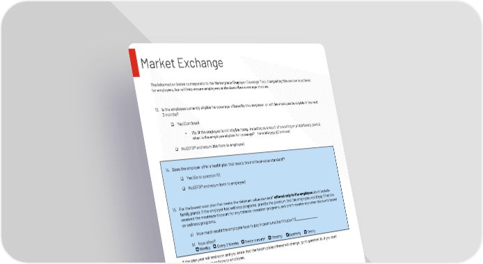 Page 28 Huntington County Community Schools | 2026 Plan Year This Compliance Overview is not intended to be exhaustive nor should any discussion or opinions be construed as legal advice. Readers should contact legal counsel for legal advice. Market Exchange The information below corresponds to the Marketplace Employer Coverage Tool. Completing this section is optional for employers, but will help ensure employees understand their coverage choices. 13. Is the employee currently eligible for coverage offered by this employer, or will the employee be eligible in the next 3 months? Yes (Continue) • 13a. If the employee is not eligible today, including as a result of a waiting or probationary period, when is the employee eligible for coverage? (mm/dd/yyyy) (Continue) No (STOP and return this form to employee) 14. Does the employer offer a health plan that meets the minimum value standard*? Yes (Go to question 15) No (STOP and return form to employee) 15. For the lowest-cost plan that meets the minimum value standard* offered only to the employee (don't include family plans): If the employer has wellness programs, provide the premium that the employee would pay if he/she received the maximum discount for any tobacco cessation programs, and didn't receive any other discounts based on wellness programs. a) How much would the employee have to pay in premiums for this plan? $_______________ b) How often? Weekly Every 2 Weeks Twice a month Monthly Quarterly Yearly If the plan year will end soon and you know that the health plans offered will change, go to question 16. If you don't know, STOP and return form to employee. 16. What change will the employer make for the new plan year? Employer won't offer health coverage Employer will start offering health coverage to employees or change the premium for the lowest-cost plan available only to the employee that meets the minimum value standard.* (Premium should reflect the discount for wellness programs. See question 15.) a) How much would the employee have to pay in premiums for this plan? $_______________ b) How often? Weekly Every 2 Weeks Twice a month Monthly Quarterly Yearly * An employer-sponsored health plan meets the "minimum value standard" if the plan's share of the total allowed benefit costs covered by the plan is no less than 60 percent of such costs (Section 36B(c)(2)(C)(ii) of the Internal Revenue Code of 1986)
