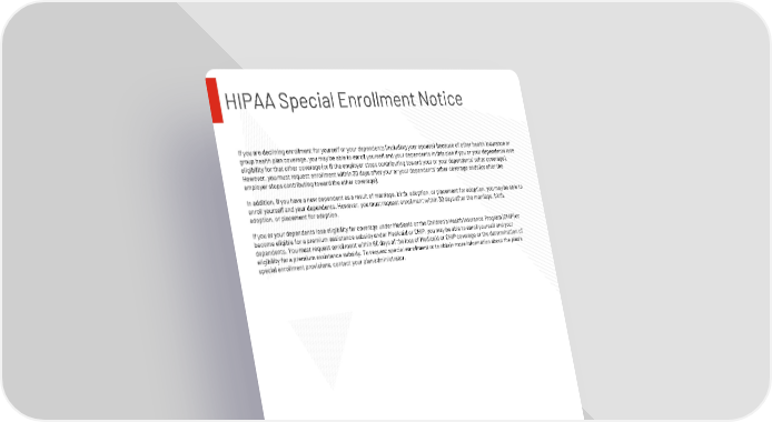Page 8 Huntington County Community Schools | 2026 Plan Year This Compliance Overview is not intended to be exhaustive nor should any discussion or opinions be construed as legal advice. Readers should contact legal counsel for legal advice. HIPAA Special Enrollment Notice If you are declining enrollment for yourself or your dependents (including your spouse) because of other health insurance or group health plan coverage, you may be able to enroll yourself and your dependents in this plan if you or your dependents lose eligibility for that other coverage (or if the employer stops contributing toward your or your dependents’ other coverage). However, you must request enrollment within 30 days after your or your dependents’ other coverage ends (or after the employer stops contributing toward the other coverage). In addition, if you have a new dependent as a result of marriage, birth, adoption, or placement for adoption, you may be able to enroll yourself and your dependents. However, you must request enrollment within 30 days after the marriage, birth, adoption, or placement for adoption. If you or your dependents lose eligibility for coverage under Medicaid or the Children’s Health Insurance Program (CHIP) or become eligible for a premium assistance subsidy under Medicaid or CHIP, you may be able to enroll yourself and your dependents. You must request enrollment within 60 days of the loss of Medicaid or CHIP coverage or the determination of eligibility for a premium assistance subsidy. To request special enrollment or to obtain more information about the plan's special enrollment provisions, contact your plan administrator.