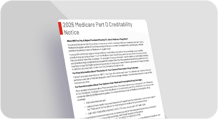 Page 24 Huntington County Community Schools | 2026 Plan Year This Compliance Overview is not intended to be exhaustive nor should any discussion or opinions be construed as legal advice. Readers should contact legal counsel for legal advice. 2026 Medicare Part D Creditability Notice When Will You Pay A Higher Premium (Penalty) To Join A Medicare Drug Plan? You should also know that if you drop or lose your current coverage with your employer and don’t join a Medicare drug plan within 63 continuous days after your current coverage ends, you may pay a higher premium (a penalty) to join a Medicare drug plan later. If you go 63 continuous days or longer without creditable prescription drug coverage, your monthly premium may go up by at least 1% of the Medicare base beneficiary premium per month for every month that you did not have that coverage. For example, if you go nineteen months without creditable coverage, your premium may consistently be at least 19% higher than the Medicare base beneficiary premium. You may have to pay this higher premium (a penalty) as long as you have Medicare prescription drug coverage. In addition, you may have to wait until the following October to join. For More Information About This Notice Or Your Current Prescription Drug Coverage… Contact your plan administrator. NOTE: You’ll get this notice each year. You will also get it before the next period you can join a Medicare drug plan, and if this coverage changes. You also may request a copy of this notice at any time. For More Information About Your Options Under Medicare Prescription Drug Coverage… More detailed information about Medicare plans that offer prescription drug coverage is in the “Medicare & You” handbook. You’ll get a copy of the handbook in the mail every year from Medicare. You may also be contacted directly by Medicare drug plans. For more information about Medicare prescription drug coverage: • Visit www.medicare.gov • Call your State Health Insurance Assistance Program (see the inside back cover of your copy of the “Medicare & You” handbook for their telephone number) for personalized help • Call 1-800-MEDICARE (1-800-633-4227). TTY users should call 1-877-486-2048. If you have limited income and resources, extra help paying for Medicare prescription drug coverage is available. For information about this extra help, visit Social Security on the web at www.socialsecurity.gov, or call them at 1-800-772-1213 (TTY 1-800-325-0778). Remember: Keep this Creditable Coverage notice. If you decide to join one of the Medicare drug plans, you may be required to provide a copy of this notice when you join to show whether or not you have maintained creditable coverage and, therefore, whether or not you are required to pay a higher premium (a penalty).