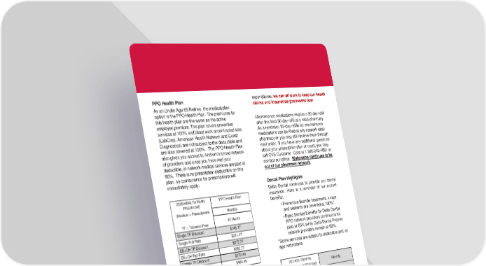 PPO Health Plan As an Under Age 65 Retiree, the medical plan option is the PPO Health Plan. The premiums for this health plan are the same as the active employee premium. This plan covers preventive services at 100% and blood work at contracted labs (LabCorp, American Health Network and Quest Diagnostics) are not subject to the deductible and are also covered at 100%. The PPO Health Plan also gives you access to Anthem’s broad network of providers and once you have met your deductible, in-network medical services are paid at 80%. There is no prescription deductible on this plan, so coinsurance for prescriptions will immediately apply. 2026 HEALTH PLAN PREMIUMS PPO Health Plan (Medical + Prescription) TF = Tobacco Free Monthly 12 Month Single TF Discount $146.17 Single Full Rate $221.17 EE+CH TF Discount $277.77 EE+CH Full Rate $352.77 Family TF Discount $379.49 Family Full Rate $454.49 EE+CH = Employee Plus Child(ren) Prescription Benefits The University participates in the Indiana Aggregate Prescription Purchasing Plan (IAPPP) for prescription coverage and the IAPPP continues to use CVS Caremark as its third-party administrator. Register online at www.Caremark.com/startnow to find network pharmacies, refill medications and check order status, check drug cost, and see your prescription history. Be reminded that you may also check drug costs through links found on the Employee Benefits website. Specialty medications are a huge cost driver to our plans. With Ball State’s health plan being self-funded, we strive for all plan members to use these links to check costs for prescriptions and see if alternatives are available. By being good stewards of our insurance expenditures, we can all work to keep our health claims and insurance premiums low. Maintenance medications require a 90-day refill after the third 30-day refill at a retail pharmacy. As a reminder, 90-day refills for maintenance medications can be filled at any network retail pharmacy or you may still receive them through mail order. If you have any additional questions about your prescription plan or costs, you may call CVS Customer Care at 1-866-243-4881 or contact our office. Walgreens continues to be out of our pharmacy network. Dental Plan Highlights Delta Dental continues to provide our dental insurance. Here is a reminder of our current benefits: • Preventive fluoride treatments, x-rays and sealants are covered at 100%*. • Basic Service benefits for Delta Dental PPO network providers continue to be paid at 85% while Delta Dental Premier network providers remain at 80%. *Some services are subject to deductible and/ or age restrictions. EE+CH = Employee Plus Child(ren) RETIREE DENTAL INSURANCE PREMIUMS Monthly Single $13.31 EE + CH $25.26 Family $34.47
