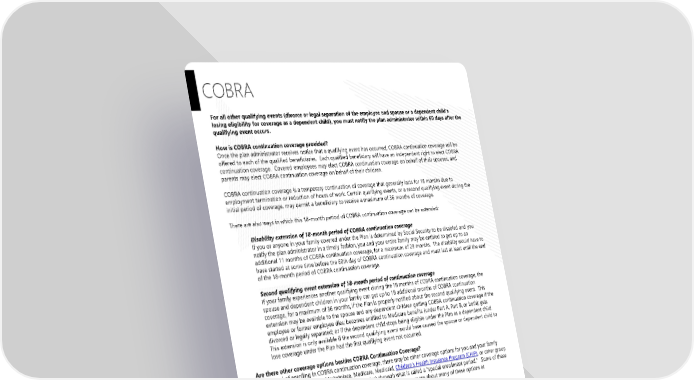 Page 20 | DePauw University | Plan Year 2026 This Compliance Overview is not intended to be exhaustive nor should any discussion or opinions be construed as legal advice. Readers should contact legal counsel for legal advice. COBRA For all other qualifying events (divorce or legal separation of the employee and spouse or a dependent child’s losing eligibility for coverage as a dependent child), you must notify the plan administrator within 60 days after the qualifying event occurs. How is COBRA continuation coverage provided? Once the plan administrator receives notice that a qualifying event has occurred, COBRA continuation coverage will be offered to each of the qualified beneficiaries. Each qualified beneficiary will have an independent right to elect COBRA continuation coverage. Covered employees may elect COBRA continuation coverage on behalf of their spouses, and parents may elect COBRA continuation coverage on behalf of their children. COBRA continuation coverage is a temporary continuation of coverage that generally lasts for 18 months due to employment termination or reduction of hours of work. Certain qualifying events, or a second qualifying event during the initial period of coverage, may permit a beneficiary to receive a maximum of 36 months of coverage. There are also ways in which this 18-month period of COBRA continuation coverage can be extended: Disability extension of 18-month period of COBRA continuation coverage If you or anyone in your family covered under the Plan is determined by Social Security to be disabled and you notify the plan administrator in a timely fashion, you and your entire family may be entitled to get up to an additional 11 months of COBRA continuation coverage, for a maximum of 29 months. The disability would have to have started at some time before the 60th day of COBRA continuation coverage and must last at least until the end of the 18-month period of COBRA continuation coverage. Second qualifying event extension of 18-month period of continuation coverage If your family experiences another qualifying event during the 18 months of COBRA continuation coverage, the spouse and dependent children in your family can get up to 18 additional months of COBRA continuation coverage, for a maximum of 36 months, if the Plan is properly notified about the second qualifying event. This extension may be available to the spouse and any dependent children getting COBRA continuation coverage if the employee or former employee dies; becomes entitled to Medicare benefits (under Part A, Part B, or both); gets divorced or legally separated; or if the dependent child stops being eligible under the Plan as a dependent child. This extension is only available if the second qualifying event would have caused the spouse or dependent child to lose coverage under the Plan had the first qualifying event not occurred. Are there other coverage options besides COBRA Continuation Coverage? Yes. Instead of enrolling in COBRA continuation coverage, there may be other coverage options for you and your family through the Health Insurance Marketplace, Medicare, Medicaid, Children’s Health Insurance Program (CHIP), or other group health plan coverage options (such as a spouse’s plan) through what is called a “special enrollment period.” Some of these options may cost less than COBRA continuation coverage. You can learn more about many of these options at www.healthcare.gov.