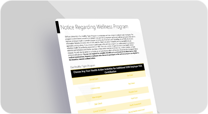 Page 31 | DePauw University | Plan Year 2026 This Compliance Overview is not intended to be exhaustive nor should any discussion or opinions be construed as legal advice. Readers should contact legal counsel for legal advice. Notice Regarding Wellness Program DePauw University’s Our Healthy Tigers Program is a voluntary wellness program available to all employees. The program is administered according to federal rules permitting employer-sponsored wellness programs that seek to improve employee health or prevent disease, including the Americans with Disabilities Act of 1990, the Genetic Information Nondiscrimination Act of 2008, and the Health Insurance Portability and Accountability Act, as applicable, among others. If you choose to participate in the wellness program you will be asked to complete a voluntary health risk wellbeing assessment or "HRA" that asks a series of questions about your health-related activities and behaviors and whether you have or had certain medical conditions (e.g., cancer, diabetes, or heart disease). You will also be asked to complete an annual physical which will include a blood test for cholesterol, blood pressure and glucose. You are not required to complete the HRA or to participate in the blood test or other medical examinations, however employees who choose to participate in the wellness program are eligible for the incentive rewards outlined below. Our Healthy Tigers Program Choose Any Four Health Action Activities for Additional $200 Employer HSA Contribution Dental Exam Eye Exam Colonoscopy Pap Smear Mammogram Prostate Exam Skin Check Heart Scan Cancer Screening Health Assessment Diabetes Mental Health Assessment Move it – 7,000 daily steps for 90 days Healthy U – complete 5 short (5-10 minute) courses