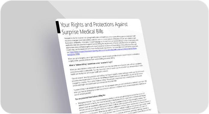 Page 14 | DePauw University | Plan Year 2026 This Compliance Overview is not intended to be exhaustive nor should any discussion or opinions be construed as legal advice. Readers should contact legal counsel for legal advice. Your Rights and Protections Against Surprise Medical Bills Pursuant to the No Surprises Act, group health plans and health insurance issuers offering group or individual health insurance coverage must make publicly available, post on a public website of the plan or issuer, and include on each Explanation of Benefits, information in plain language on the restrictions on balance billing in certain circumstances, any applicable state law protections against balance billing, the requirements of the Act, and information on contacting appropriate state and federal agencies to report suspected violations of these balance billing restrictions. Plans and issuers may use this model notice to meet the disclosure requirements. For more information and further instructions, see https://www.cms.gov/httpswwwcmsgovregulations-and-guidancelegislationpaperworkreductionactof1995pra- listing/cms-10780. When you get emergency care or get treated by an out-of-network provider at an in-network hospital or ambulatory surgery center, you are protected from surprise billing or balance billing. What is “balance billing” (sometimes called “surprise billing”)? When you see a doctor or other health care provider, you may owe certain out-of-pocket costs, such as a copayment, coinsurance, and/or a deductible. You may have other costs or have to pay the entire bill if you see a provider or visit a health care facility that isn’t in your health plan’s network. “Out-of-network” describes providers and facilities that haven’t signed a contract with your health plan. Out-of-network providers may be permitted to bill you for the difference between what your plan agreed to pay and the full amount charged for a service. This is called “balance billing.” This amount is likely more than in-network costs for the same service and might not count toward your annual out-of-pocket limit. “Surprise billing” is an unexpected balance bill. This can happen when you can’t control who is involved in your care—like when you have an emergency or when you schedule a visit at an in-network facility but are unexpectedly treated by an out-of-network provider. You are protected from balance billing for: • Emergency Services: If you have an emergency medical condition and get emergency services from an out-of- network provider or facility, the most the provider or facility may bill you is your plan’s in-network cost-sharing amount (such as copayments and coinsurance). You can’t be balance billed for these emergency services. This includes services you may get after you’re in stable condition, unless you give written consent and give up your protections not to be balanced billed for these post-stabilization services. Certain services at an in-network hospital or ambulatory surgical center: When you get services from an in-network hospital or ambulatory surgical center, certain providers there may be out-of-network. In these cases, the most those providers may bill you is your plan’s in- network cost-sharing amount. This applies to emergency medicine, anesthesia, pathology, radiology, laboratory, neonatology, assistant surgeon, hospitalist, or intensivist services. These providers cannot balance bill you and may not ask you to give up your protections not to be balance billed.